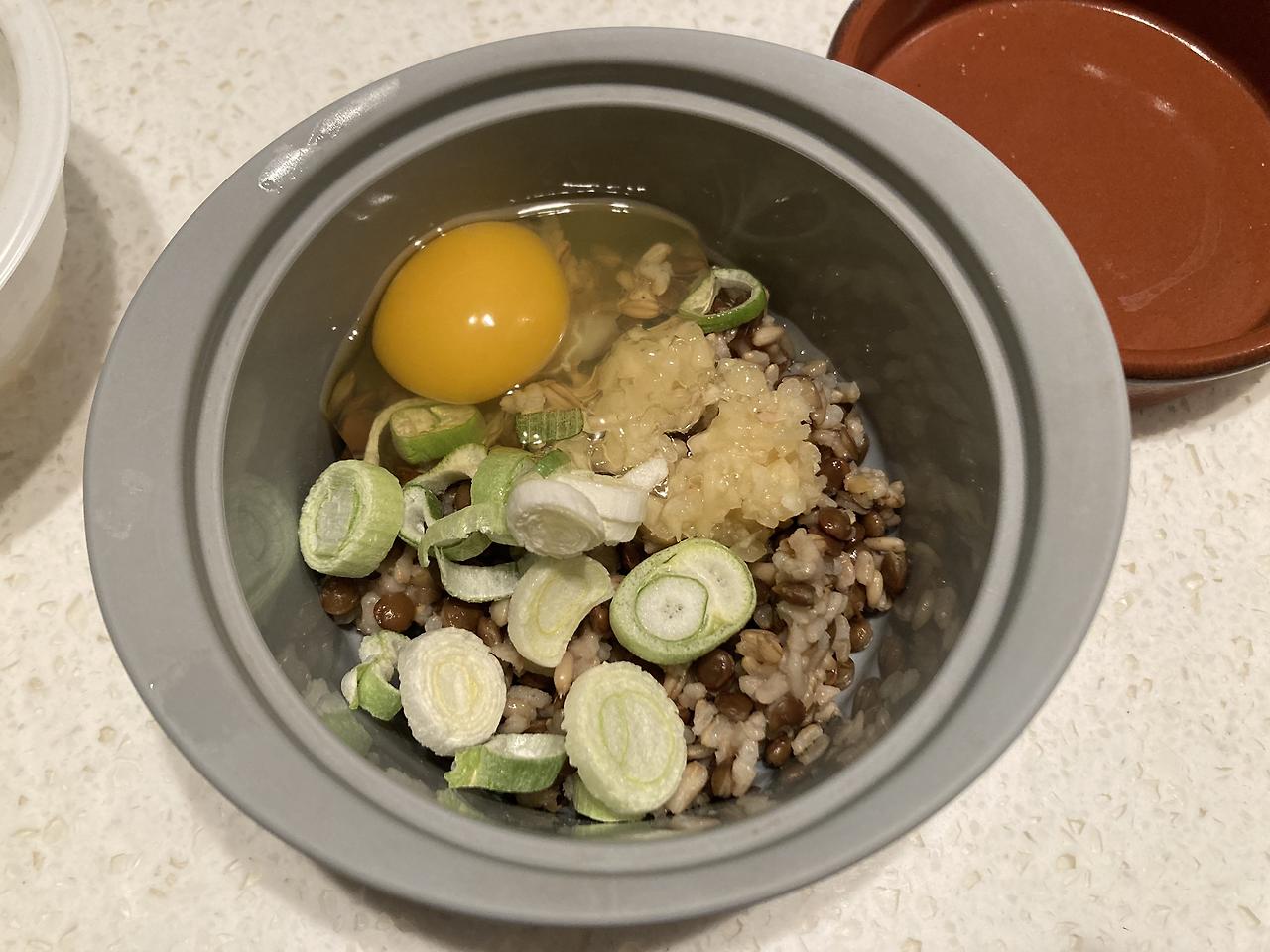 계란 노른자를 터트려 풀고 밥과 적당히 섞는다. (렌틸콩현미밥은 찰기가 없어 잘 섞인다. 다른 즉석밥이라면 레인지에 30초 정도 돌려야 밥알이 풀린다.)