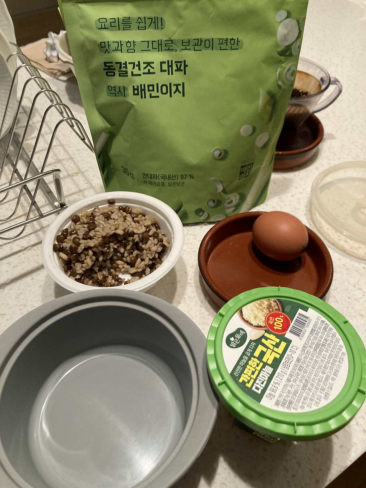 실리콘 용기에 즉석밥, 계란, 대파, 마늘 넣고, 새우는 물에 살짝 헹구어 넣고 후추를 뿌린다.