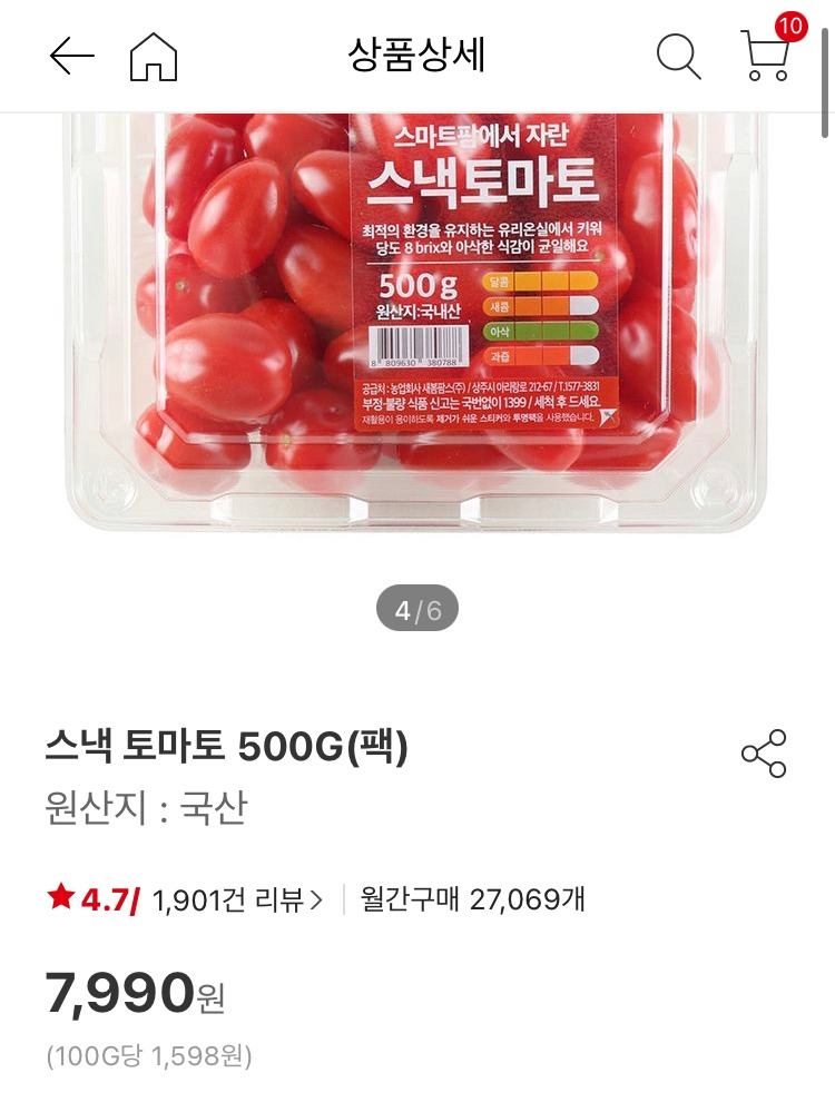 스낵 토마토 500g: 마트에서 3,990원에 할인하기에 냉큼 사 왔다. 꼭지가 없다!!! 세척하기 진짜 편하다. 스테비아 처리된 제품이 아니라서 좋다.