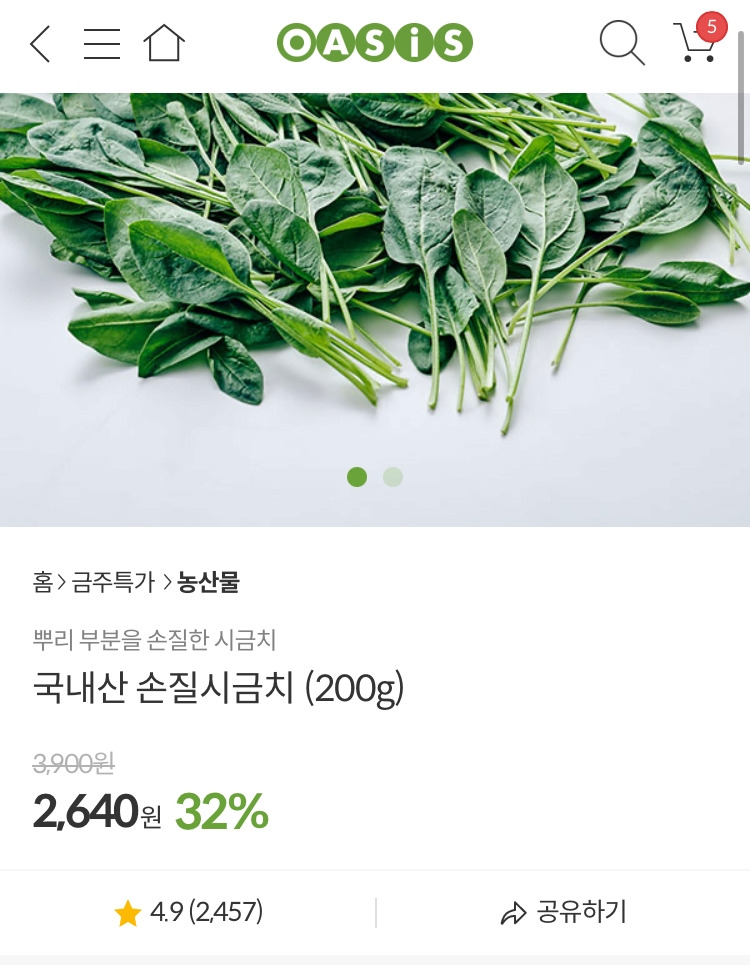 국내산 손질 시금치 200g: 오아시스몰. 시금치 손질하기 싫어 못 먹었는데 최고! 받아보니 잎이 두툼하고 크다. 손바닥 만하다. 씻기 편해서 좋다. 양 엄청 많음.