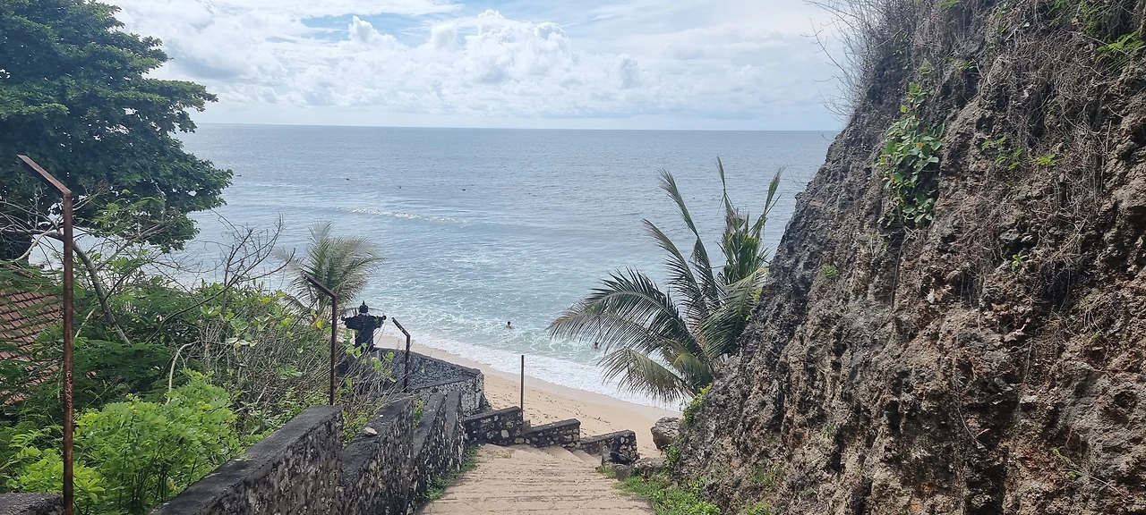 발랑안 비치는 내륙에서 해변으로의 접근성이 그리 좋지는 않다. 좁은 길로 로컬 식당 몇 개를 지나 걸어가다 보면 바다로 연결되는 통로가 한 군데 있는데 바로 계단이다. 확트인 해변을 멀리서부터 눈에 담으며 맞이하는 해변이라기보다는 '여기에 바다가 있긴 한 거야?' 하는 의심을 코로 들어오는 바다 내음으로 지워가며 찾아가는, 숨겨진 장소다. 해변에 닿은 가파른 계단 역시 낮은 개방성 한몫한다. 걸음마를 시작한 아이들이 직접 내려가가는 힘들 듯하며 파도의 출렁임만으로도 가만히 떠있던 몸이 쓸려가는 물결의 힘을 느낄 수 있다. 이래서 중급 서퍼들이 찾는 곳이구나 하는 생각이 든다.
