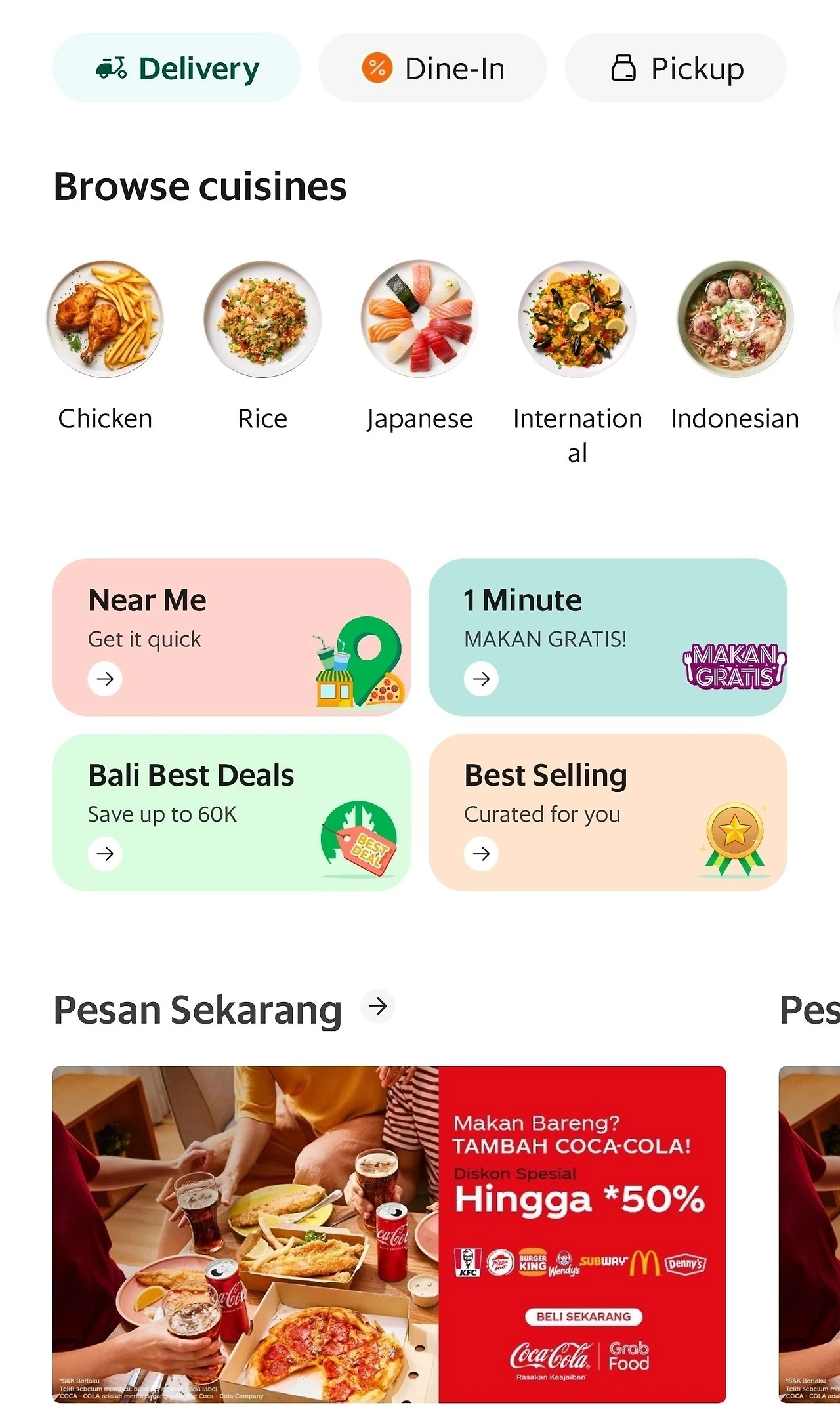 그랩은 택시 이용뿐만 아니라 음식 배달 서비스로도 편하게 사용할 수 있다. 나가서 먹는 음식이 지겨울 때 다양한 종류의 음식을 종류별로 설정하여 선택한 후 배달해 먹을 수 있다. 음식이 조리되는 시간, 배달 시간 등이 실시간 정보로 뜨기 때문에 더욱 유용하다. 그랩과 비슷한 앱으로는 [Gojeck]이 있다. 두 앱의 가격차를 비교해 보고 더 저렴한 쪽으로 선택하면 된다.