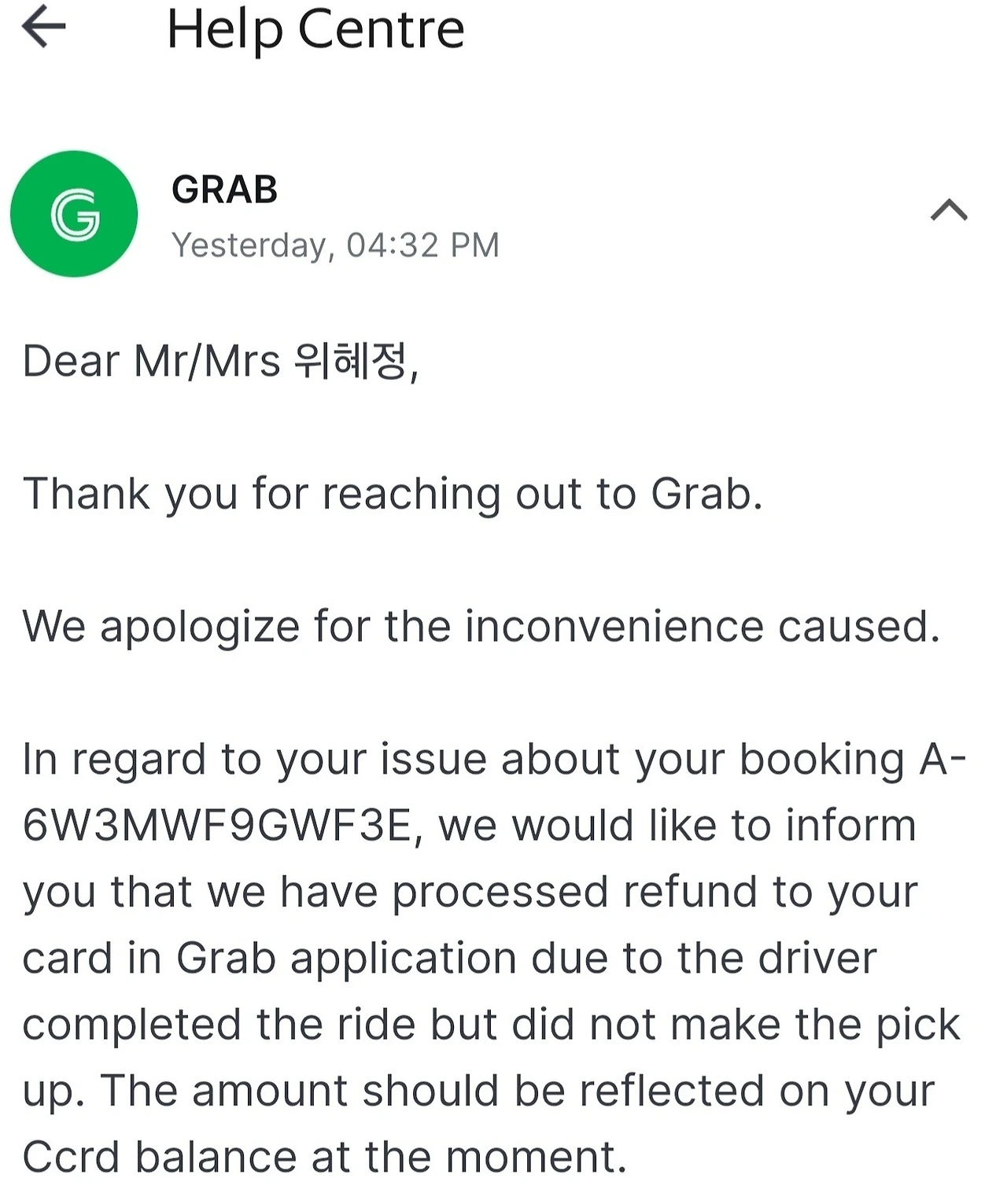 그랩으로 택시를 잡은 후에 30분이 지나도 기사가 나타나지 않았다. 그때부터 이미 사기의 전조를 알아봐야 했다(보통 택시 기사는 10분 내에 픽업을 하러 오는 편이다). 하도 나타나지 않아서 문자를 보내자 내가 기다리고 있는 곳으로 올 수 없다고 당황스러운 답을 준다. 다른 택시를 잡겠으니 택시 서비스를 취소해 달라고 했다(취소는 이용자나 택시기사가 모두 할 수도록 되어있다). 그랬더니 황당하게도 취소가 아닌, 임무 완수로 택시비를 결제처리해 버리는 것이 아닌가. 날름 먹튀를 한 것이다! 여러 번 문자를 보냈지만 이전과는 달리 답이 없다. 가만히 있지 않겠노라 다짐하며 그랩의콜센터 격인 소비자 민원 센터에 장문의 메일을 보냈다. 24시간 내에 답변을 해주겠다는 안내에 맞춰 하루가 지난 다음날 답변이 왔다.택시비는 환불이 되었고 택시기사는 선도 교육을 시키거나 일정 기간 영업 정지라는 조치를 취하겠노라 후속 메일이 도착했다.