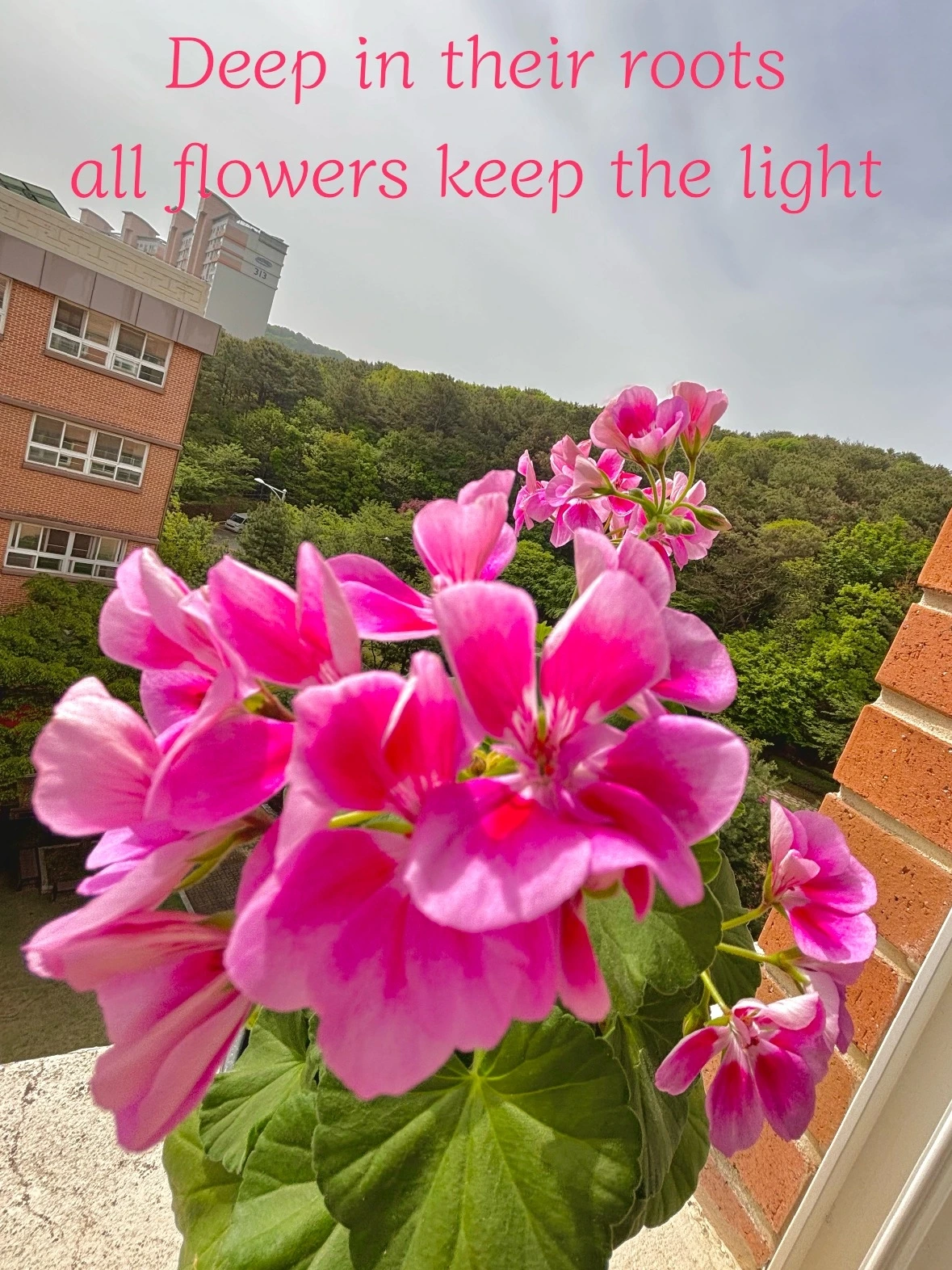 연거푸 찬탄의 박수를 쳐대는 교실의 기쁨을 의식한 듯 꽃들은 뭉쳐있지만 서로에게 뭉개지지 않고 각자의 색조를, 그 아름다운 자태를 뽐낸다. 제라늄이 이렇게 매혹적인 꽃이었는지 예전엔 미처 몰랐다.