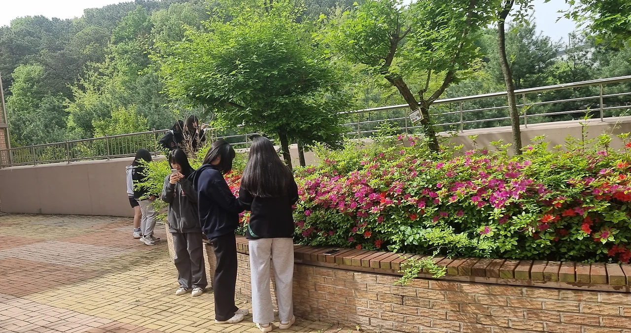 우리는 시공간을 분리시켜 먼 곳으로 이동하는 것만이 여행이라고 생각하지만 '여기'에서 행복을 찾는 것이 여행이라고 한다. 저 너머의 목적지가 아닌, 일상에 도착하는 것이 무엇보다 중요하다. 1차 지필 평가를 치른 바로 다음 날, 시험 결과와 상관없이 우리가 서있는 이 순간을 포착하는 경험, 일상 여행을 하면 어떨까 싶었다. 톡 터져버린 봄기운의 완연함을 그냥 지나칠 수도 없다. 아이들을 교실밖으로 데리고 나갔다. 봄을 만지고, 봄을 찍었다. 여기에 아름다운 문구들을 버무려 시절의 한 순간을 남기는 미션을 주었다. 5월에 찍을 졸업사진을 위해 짜둔 모둠별로 그리고, 개인별로 교정 여기저기의 봄을 담는 아이들과 함께 봄 안으로 들어간다. 봄이 고팠나 보다. 봄으로 배부른 것을 보면.