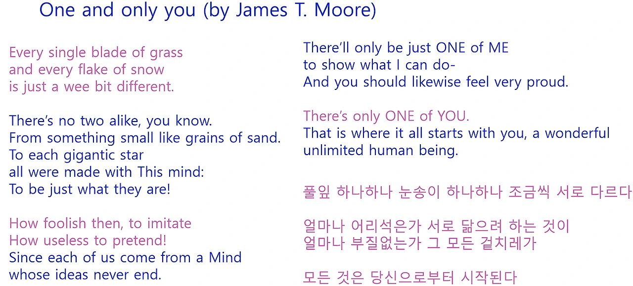 이 세상에 하나밖에 없는 각자는 이 세상에 하나밖에 없는 삶을 살아간다. 평균치를 따라가려 아등바등할 필요가 없다. 서로 닮으려고 하는 것이 어리석고 부질없는 겉치례라고 시는 말한다. 그러니 우울해하지 않아도 된다. 나만의 이야기를 써가면 되는 것이니. 그 모든 것은 나로 부터 시작되는 것이다.