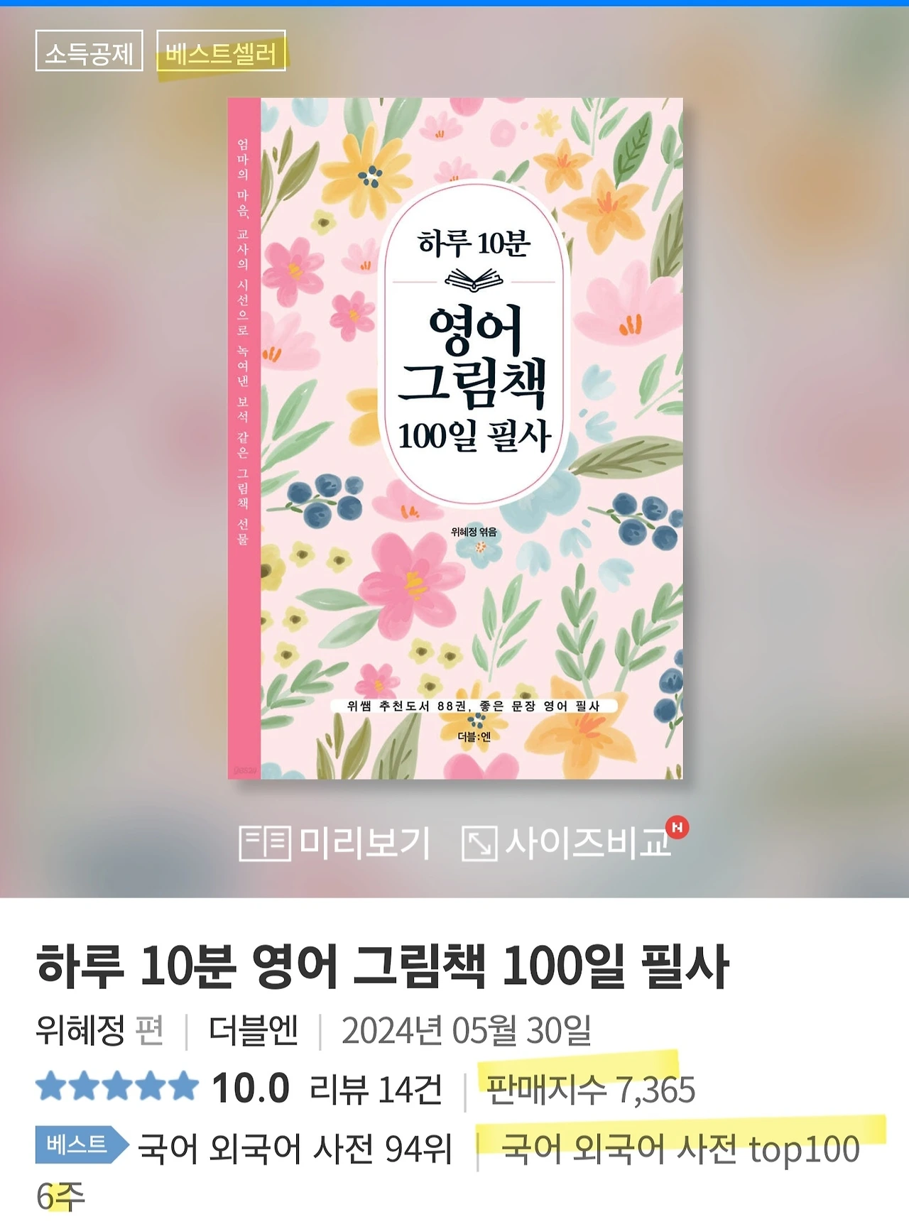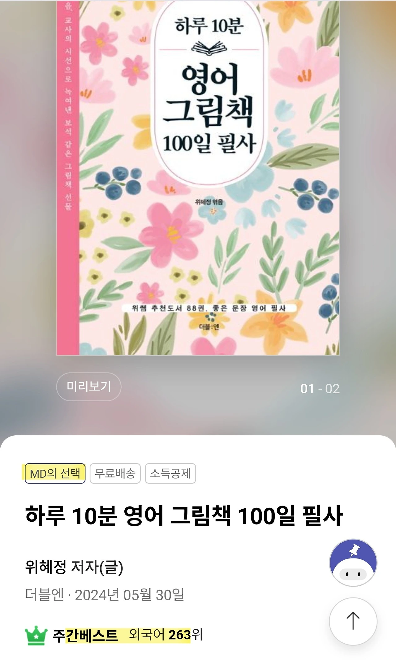 책이 출간된 지 두 달째로 접어든다. 출간 직후, 인터넷 교보에서 [MD의 선택]에도 선정되어 배지를 달았고 Yes24에서도 꾸준히 판매지수가 올라가고 있다. 초대박 베스트셀러와 비교하면 지극히 미미한 수준이지만 별다른 광고 홍보 채널이 없음에도 잘 버텨주는 책이, 그리고 책을 찾아주는 독자들이 그저 고마울 뿐이다. 무엇보다, 아들과 함께 책을 활용할 수 있다는 것이 큰 보상인 것 같다. 고마워, 영어 그림책 필사!