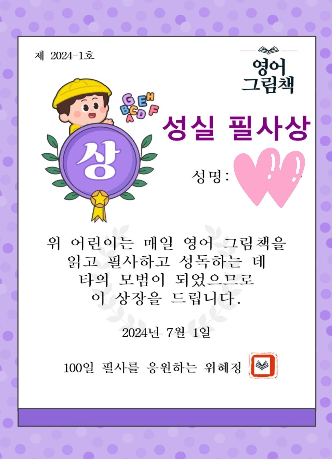 필사 시작 시점에서의 열정이 점차 식어 갈수록 쓰는 분량이 줄어만 간다. 그래도 한 줄이라도 꾸준하게 끄적여온 성실함에 큰 의의를 둔다. 6월 한 달간의 노력에 대한 보상, 상장과 상품을 수여했다. 건담 시리즈의 신간주를 신나게 사들고 3일 밤낮을 조립에 매진한다. 꽤나 멋진 로봇이 모습을 드러낸다. 멋지다! 다음 한 달의 필사 미션도 완수해서 어떤 로봇을 살지 벌써부터 고민한다. 어린이에게 외적 보상은 필수다. 내적 보상으로 넘어가는 것을 어떻게 도와주어야 할지 고민되는 지점이기도 하다.