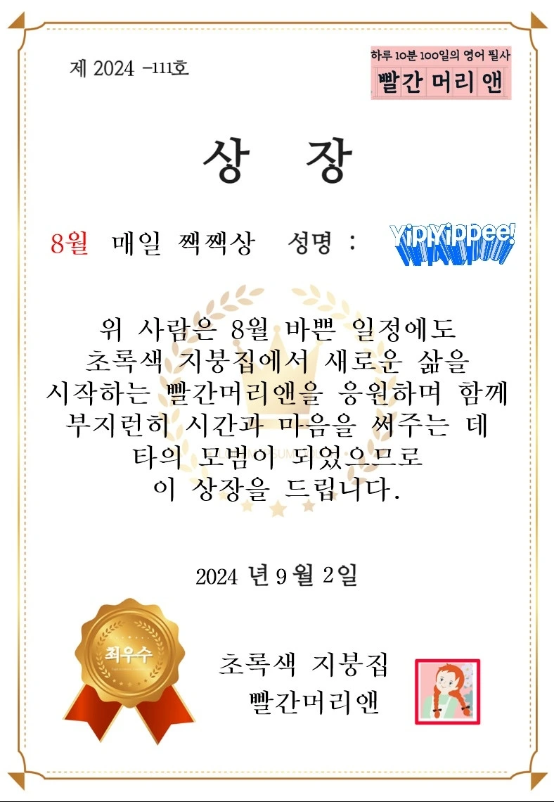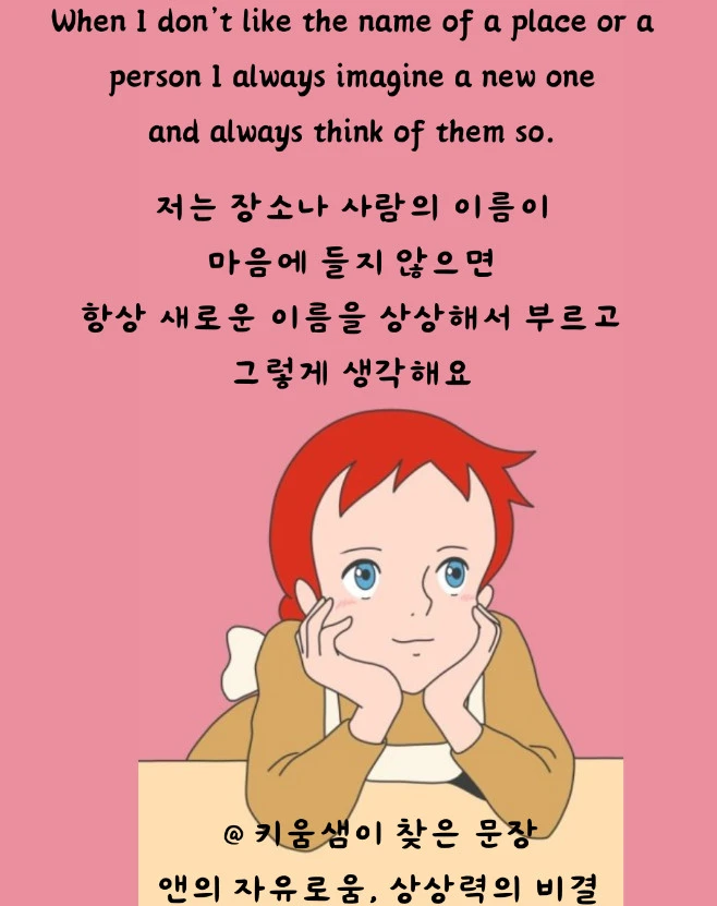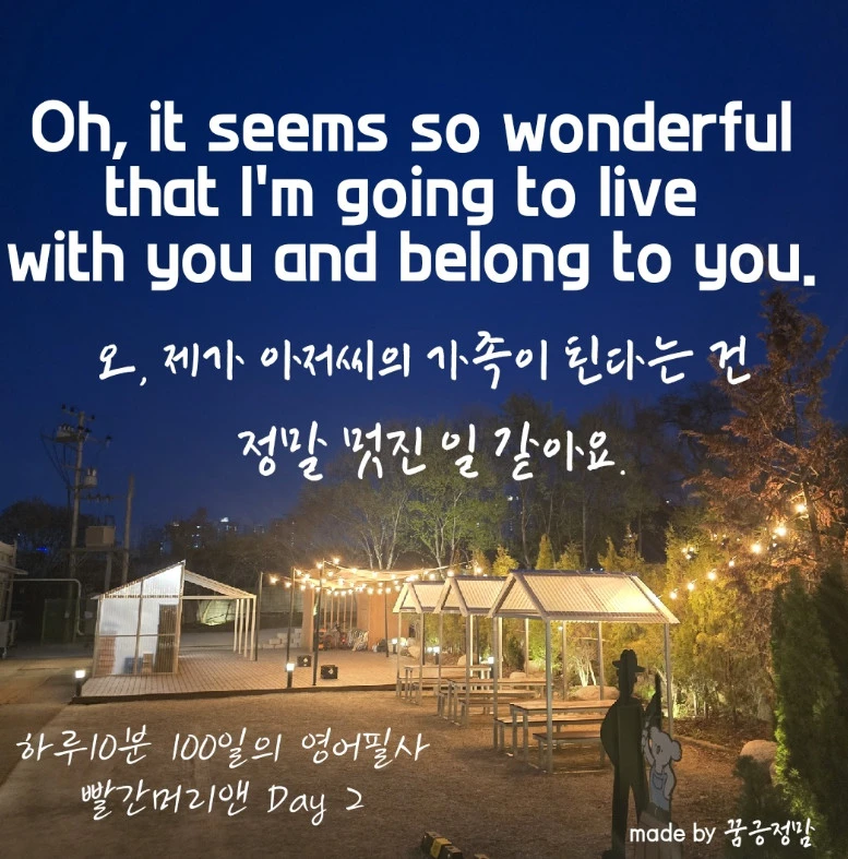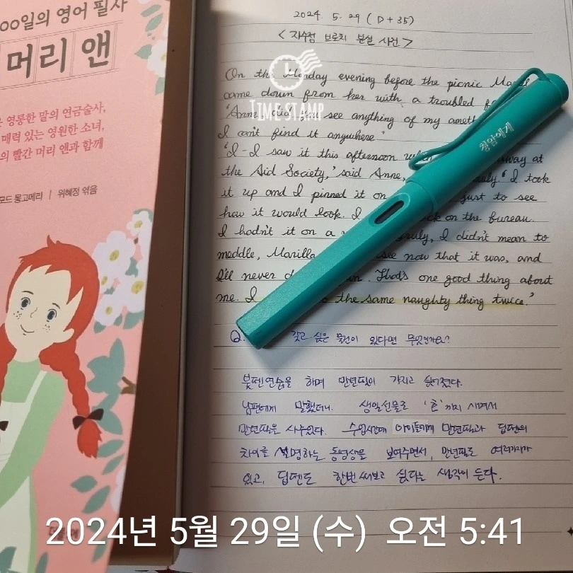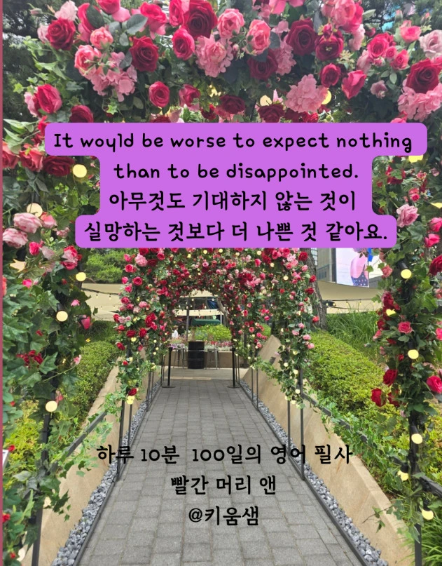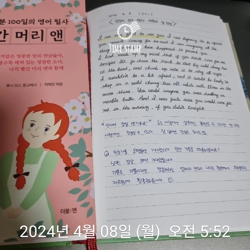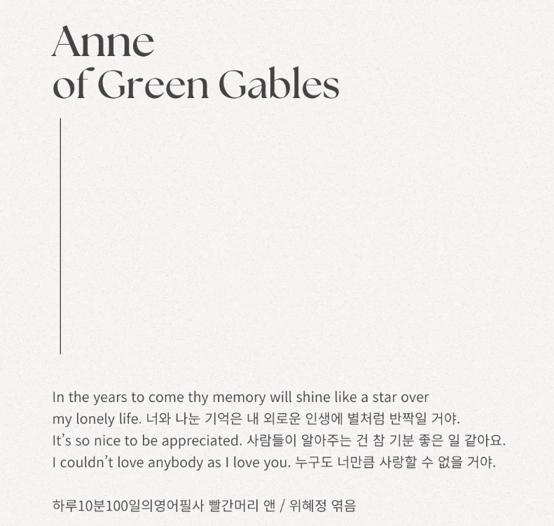 영어 필사를 통해 앤님들 각자가 가져간 경험은 다르겠지만 공통점이 있다면 '자기 발견'과 '정겨운 대화'의 시간이 아닐까 한다. 그저 '영어'를 그대로 옮겨 쓰는 기계적인 작업이 아니라 질문을 통해 나를 돌아보고 성찰하며, 같은 질문에 대한 다른 생각과 관점을 이해하고 공감하는, 내가 더 넓어지는 풍성함이라고 해야 할까. 내가 그랬다.