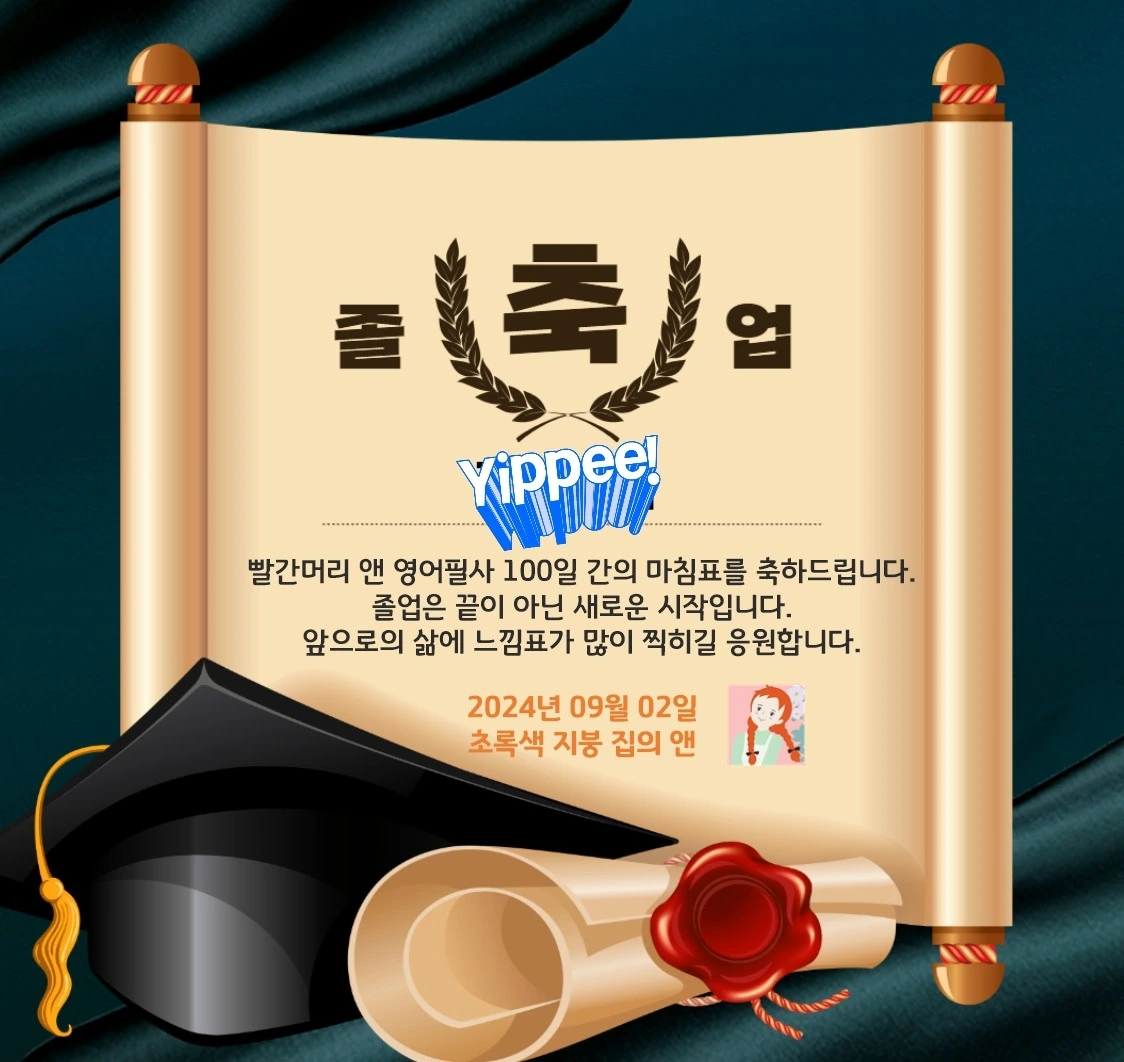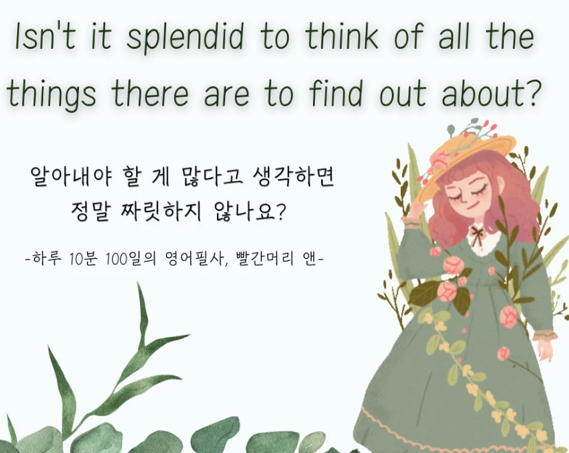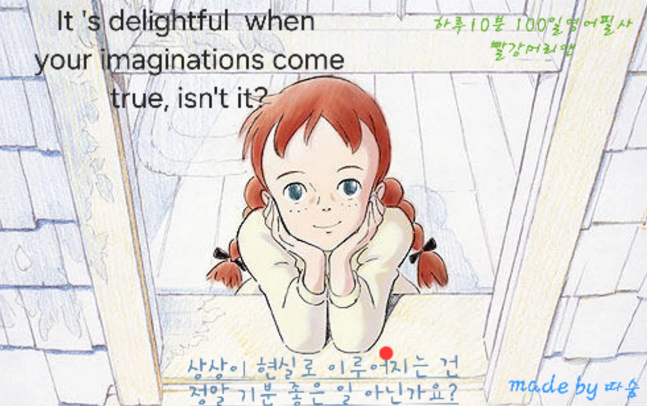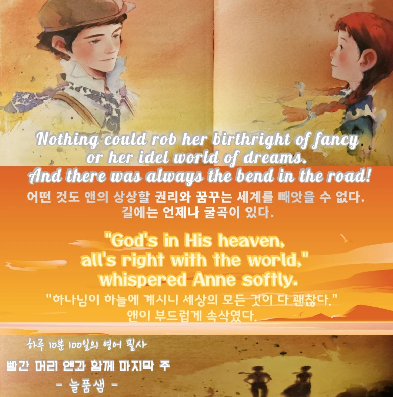 <어린 왕자>에 이어 두 번째 영어 필사 100일의 대장정은<빨간 머리 앤>과 함께였다. 꽃피는 봄날에 시작되어 더운 여름을 지나 가을의 문턱 앞에서 마침표를 찍은 지난 5개월은 이제 하나의 추억이 되었다. 하루, 이틀이 지나 순식간에 100일을 채우다니, 날마다의 축척이 큰 덩어리로 가슴을 채운다.