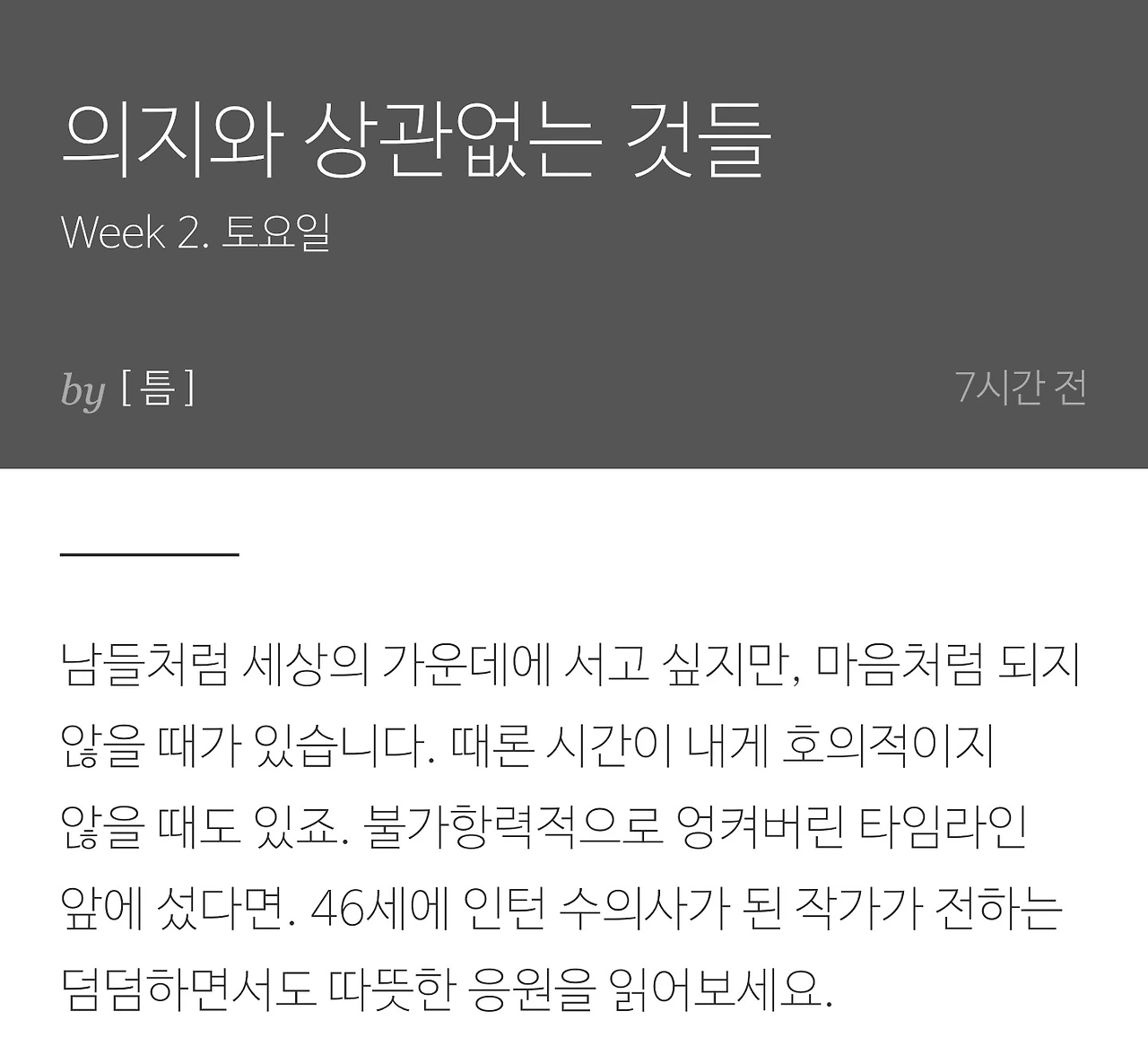 [틈]에 두 번째 노출이 되었다. <인생에 지각은 없다> 같은 글이다. 브런치에 첫 발을 들인 후, [늦깎이 인생의 힘]이라는 첫 브런치북의 서문으로 배치한 글이기도 하다. 글을 쓸 때는 담담하게 나만의 서사를 풀어놓는다고 생각했지만 나처럼 뒤늦은 걸음을 걷고 있는 사람들이 많은가 보다. 뜻과 의지로 흘러가지 않는 인생, 뒤늦게 삶의 방향을 틀어 제2의 인생 열정을 뿜어내는 분들도 많아진 것 같다. 결이 같은 사람들이 많다는 생각에 살짝 위안도 된다.