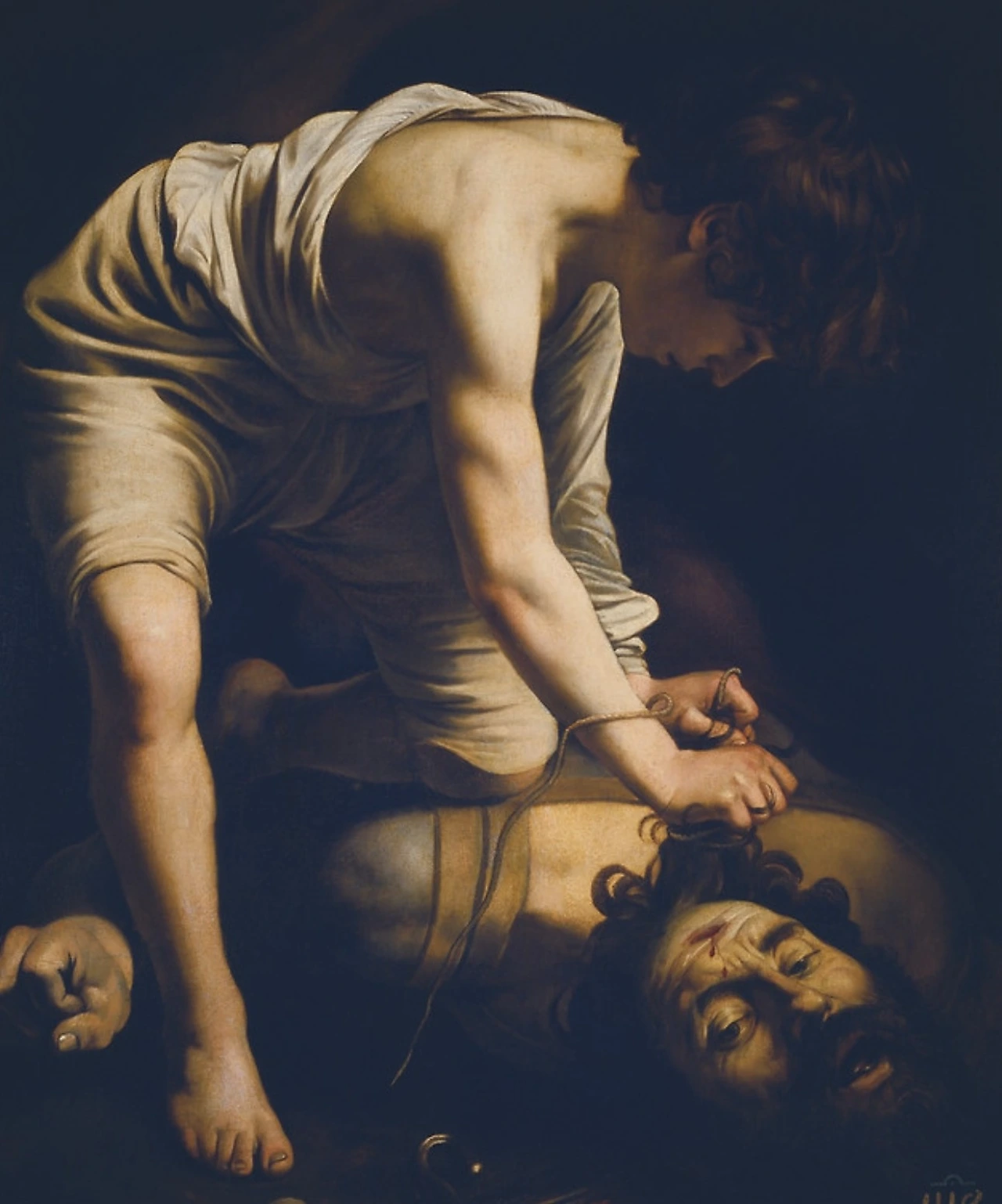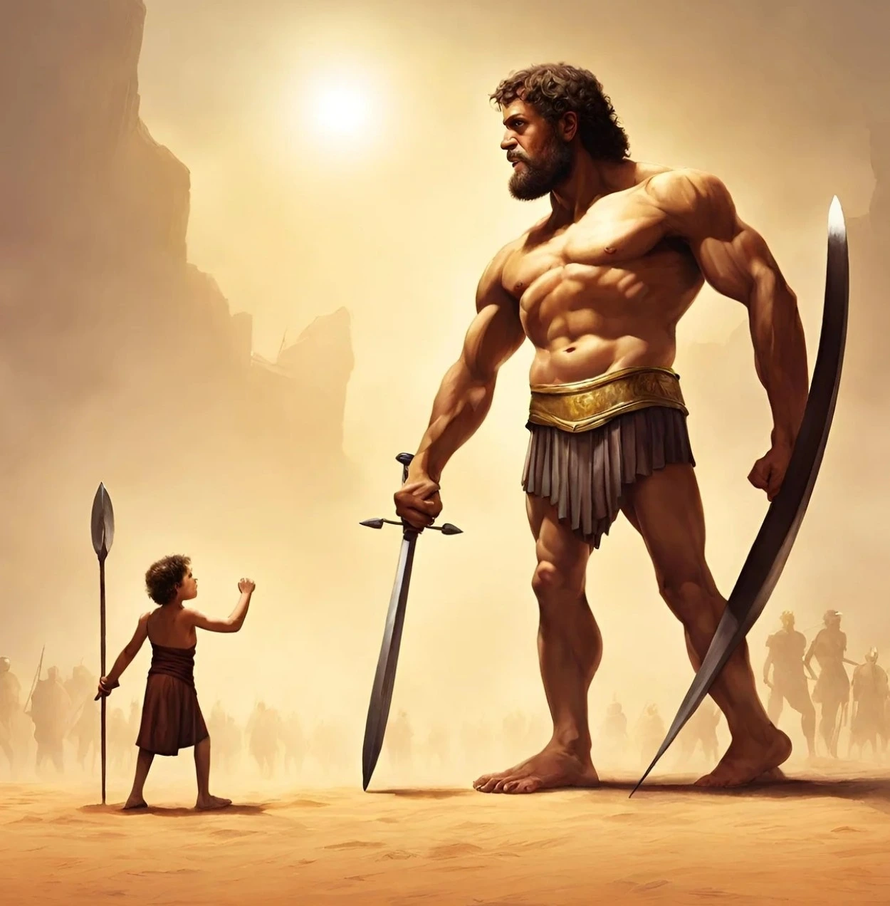 다윗과 골리앗의 싸움은 구약의 사무엘서 17장에등장합니다.다윗은 이새의 여덟 번째 막내아들로 양을 치던 목동, 어린 소년이었습니다. 그는이스라엘과 블레셋이 전쟁으로 대치하고 있을 때, 전장에 나가있던 형들의 안부를 살피기 위해아버지의 심부름을 가게 되었습니다. 볶은 곡식과 떡을 전달하러 갔던 다윗은 이스라엘과 블레셋의 대치상황에서 골리앗이라는 블레셋 장군을 처음 보게 됩니다. 성경에서 묘사하고 있는 골리앗은 3m의 거대한 체구에걸치고 있는 투구와 갑옷의 무게만 57kg인, 외형만으로도 두려움을 부르는 괴력의 사나이었습니다. 그는 40일간 자신을 쓰러뜨릴 1:1의 상대를 보내라고 겁박하며 이스라엘군들을 공포에 떨게 만들었습니다.