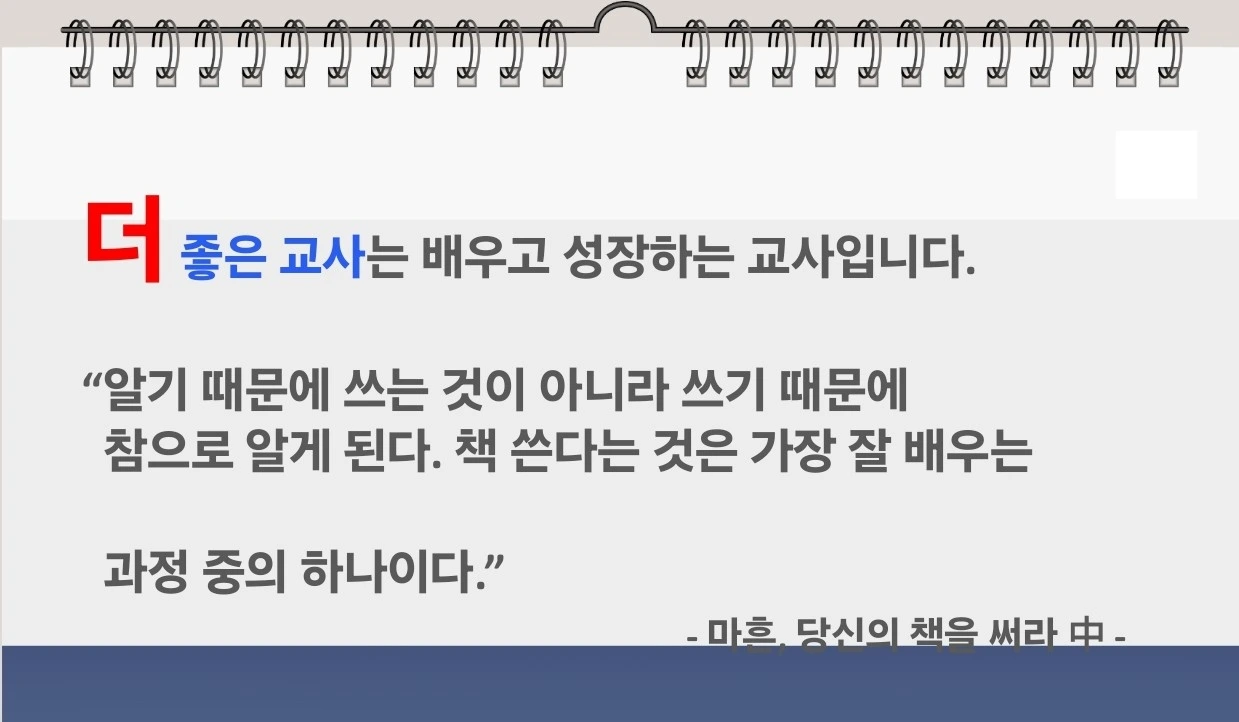 처음 마음먹은 것과 달리 책 쓰기를 부담과 스트레스로 느끼는 분들께 건넨 말이다. 학생들을 가르치기 위해 매일 읽고 쓰는 텍스트 친화력에서 교사만 한 직업군이 없다. 교사 작가가 많이 탄생하는 이유이기도 한 것 같다.본문 쓰기의 어떤 기법보다는 글쓰기에 대한 동기와 북돋움이 되는 시간이었길 바란다. 마지막으로 교직 생활 내내 개인적으로 쥐고 있었던 '성장'이라는 키워드를 나누었다. 가장 잘 배우고 성장하는 과정 중의 하나가 책 쓰기라는 메시지가 개인적인 삶에도 새겨졌다.