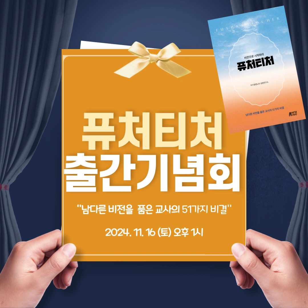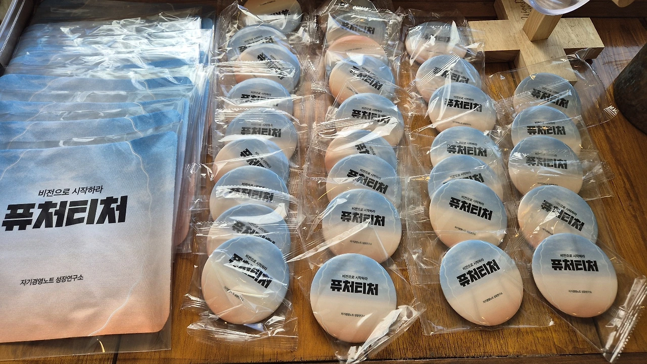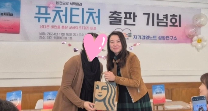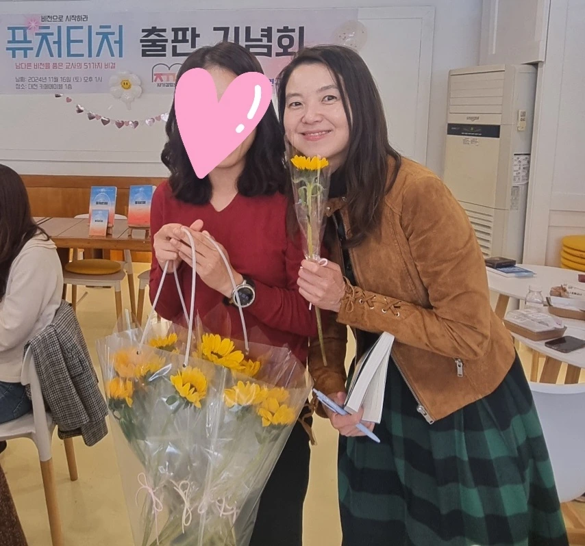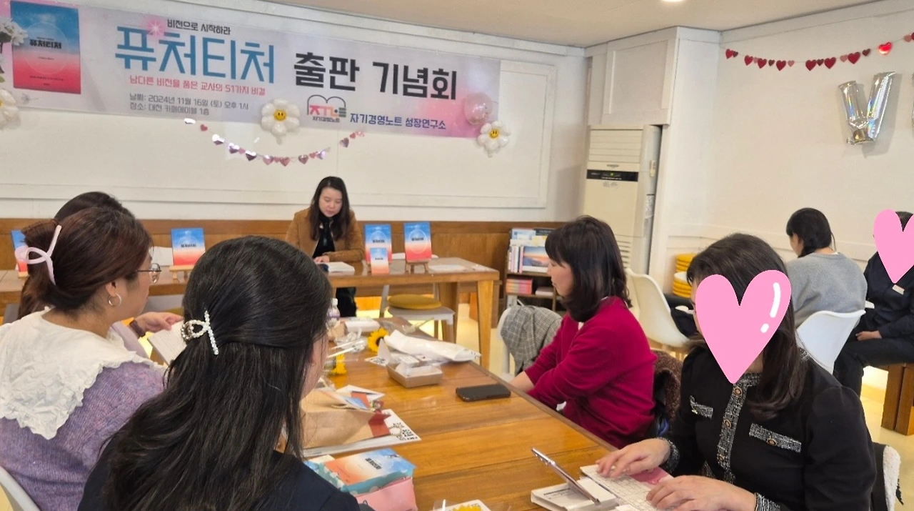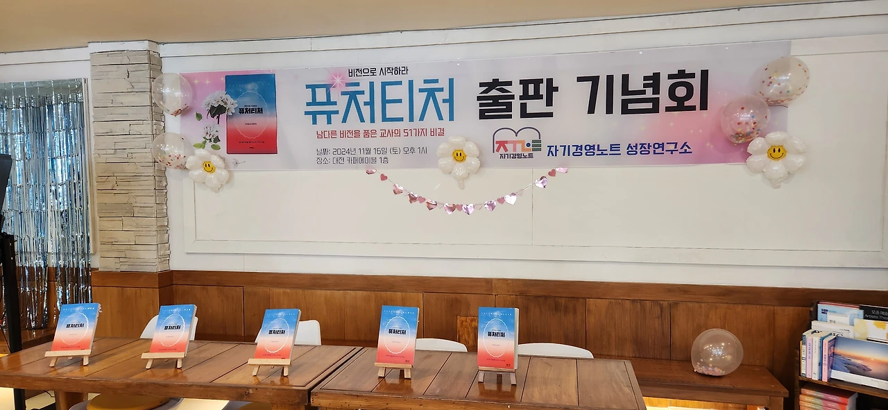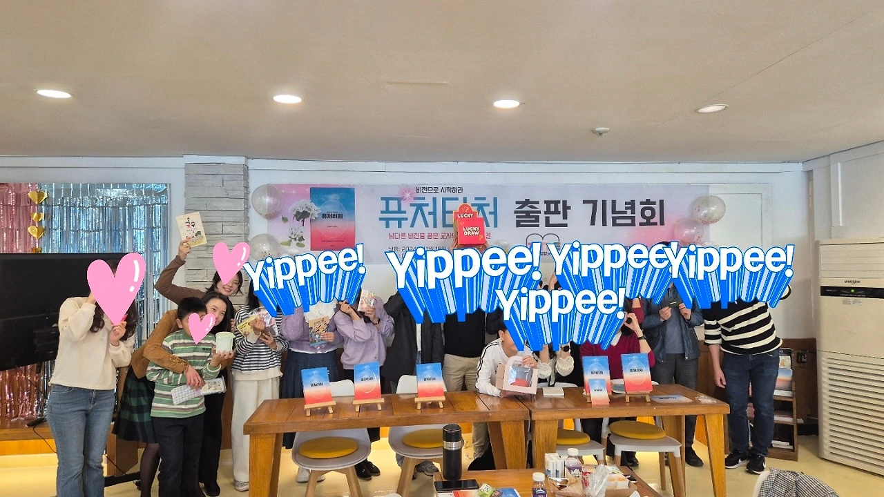 아침 일찍 도착해서 공간을 장식해 주신 선생님들 덕분에 퓨처티처만의 분위기가 가득하다. 포롱샘이 공수해 오신 센스만점 케이크와 영국에서 날아온 이넢샘의 카드가 입구에서부터 손님맞이를 제대로 하고 있다. 풍성한 간식과 굿즈, 아름다운 선물들로 눈호강이 시작된 처음부터 끝까지 웃기고 웃고 화기애애한 분위기가 넘쳐흐른다. 2쇄를 가볍게 넘긴 공저의 파워로 각자의 삶에서 뽑아낸 비전을 반드시 현실로 보게 되리라는 자신감 내지는 희망과 함께다.