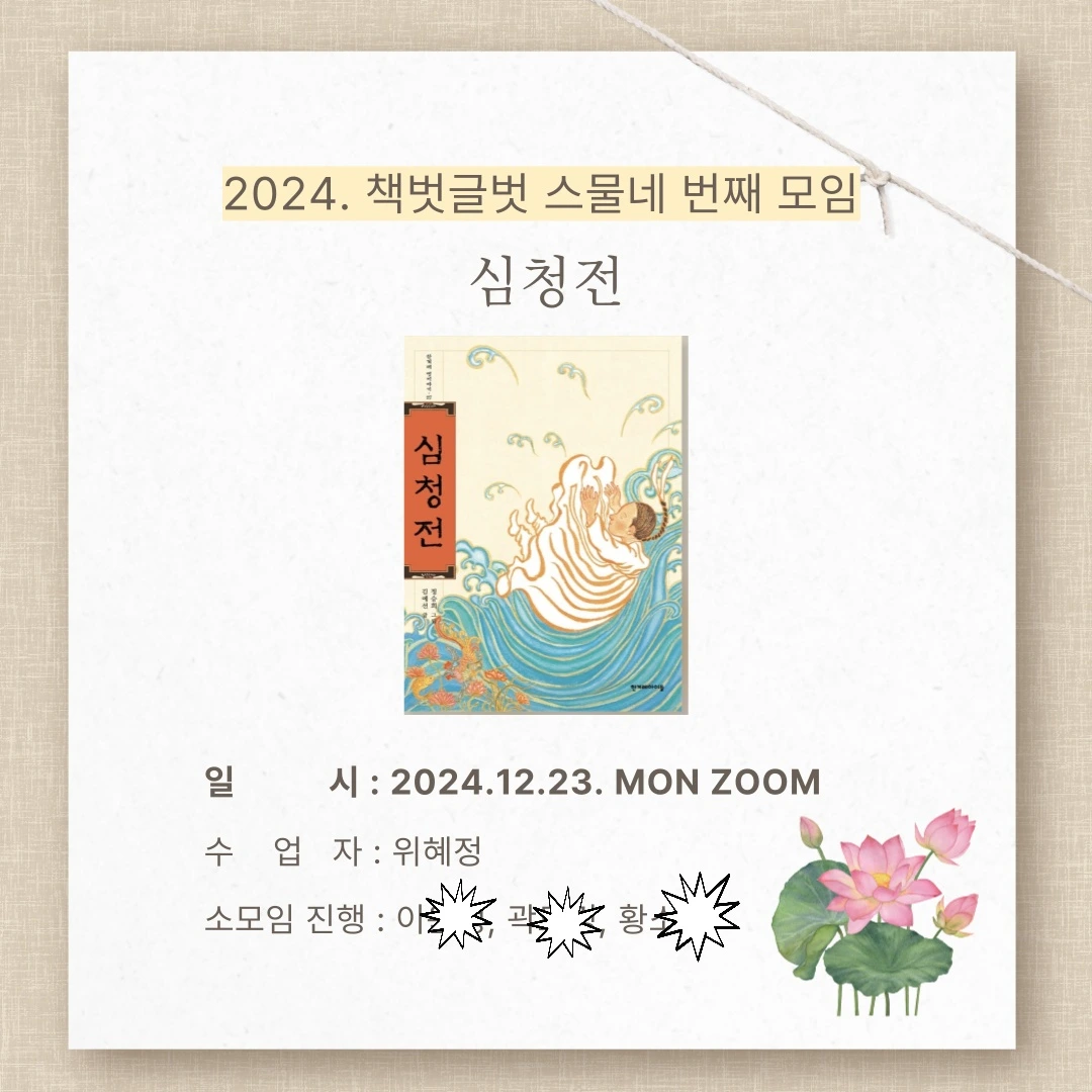 한 달에 두 번, 전국 곳곳에서 15명의 아이들이 줌으로 만난다. 오프 모임이 아니라서 살짝 염려가 되기도 했지만 기우였다. 올망졸망 아이들이 화면에 담긴 모습을 보고 있노라면 오프 못지않은 애정과 열정이 실린다. 직접 만나본 적은 없지만 모임의 횟수가 더해질 때마다 낯섦이 밀려가고 친밀감이 차오른다. 지정 도서를 읽고 온라인에서 모이면, 이미 수업에 베테랑이신 선생님들이 돌아가며 재능 기부로 독후 시간을 꾸려 주신다. 2024년 마지막 책은 <심청전>이다. 한 해를 마무리하는 이벤트와 함께 아이들과 만났다.
