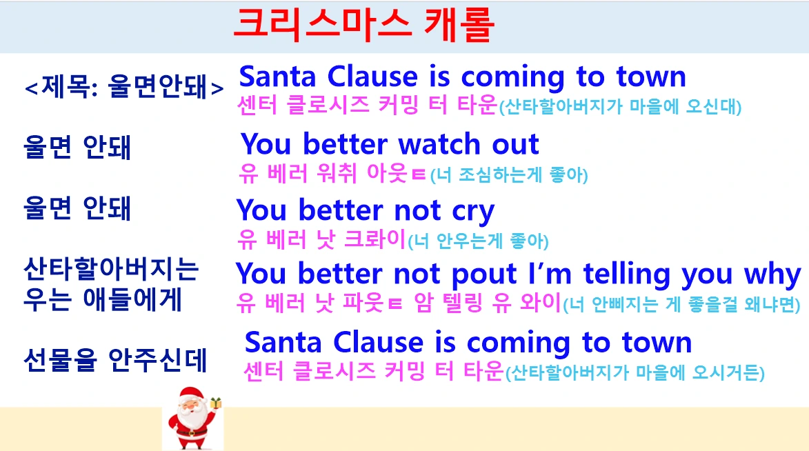 크리스마스 분위기를 흠씬 느끼며 아이들은 빨강, 초록, 장식용품 등 드레스 코드에 맞춰 입장한다. 산타 혹은 루돌프 머리띠, 빨강 목도리, 빨간 망토, 왕관 등 가지 각색의 빨강 초록 물결이 각자의 귀여움을 돋워 준다. 매수업 시작의 리추얼인 동시 읽기를 접고 크리스마스 캐럴로 전환해 본다. 전곡이 아닌, 일부를 떼어 영어로 노래를 불러보는 시간을 가졌다. 크리스마스 때마다 듣고 불러왔던 <울면 안 돼>의 원곡은 가사와 제목이 한국어 버전과는 완전히 딴판이다. 영어든 한국어든 꽁냥꽁냥 잘 따라 부르는 아이들의 모습이 그저 예쁘다.