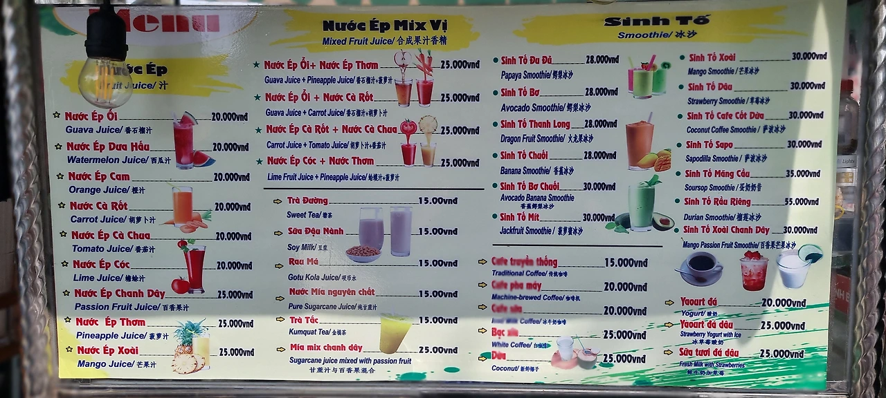 그 외에 열대 과일을 내세운 음료들이 다양하다. 대표적인 것이 아보카도/바나나/망고 스무디, 사탕수수+패션푸르트 주스, 구아바 주스, 용과 주스 등이다. 생과일을 즉석에서 갈아주는데 단맛이 싫으면 설탕이나 연유를 빼달라고 취향에 맞게 주문하면 된다. 길가에서는 25,000동~30,000동 정도이고 한화로 2,000원 이하의 음료로 부담 없이 즐길 수 있다.