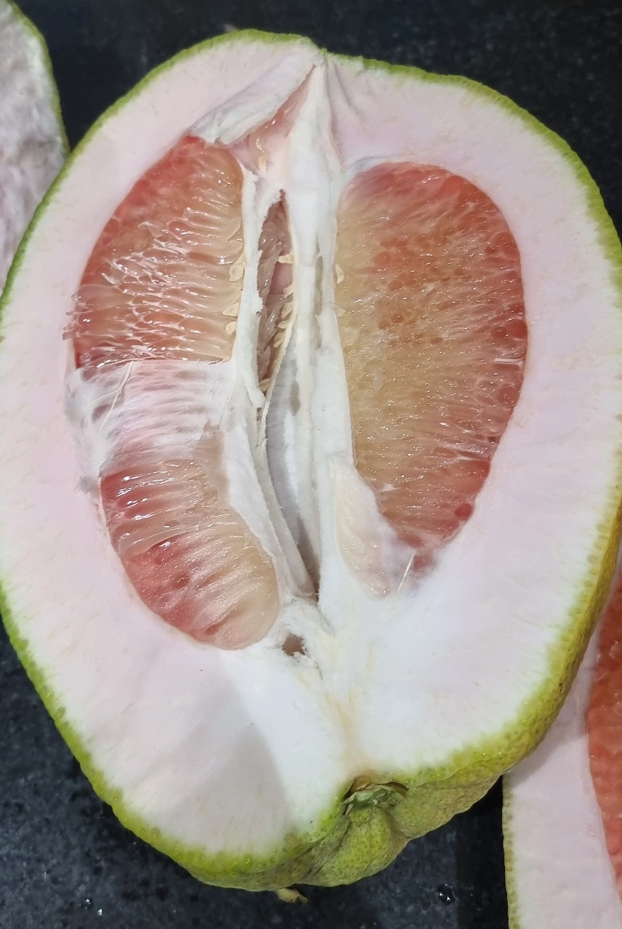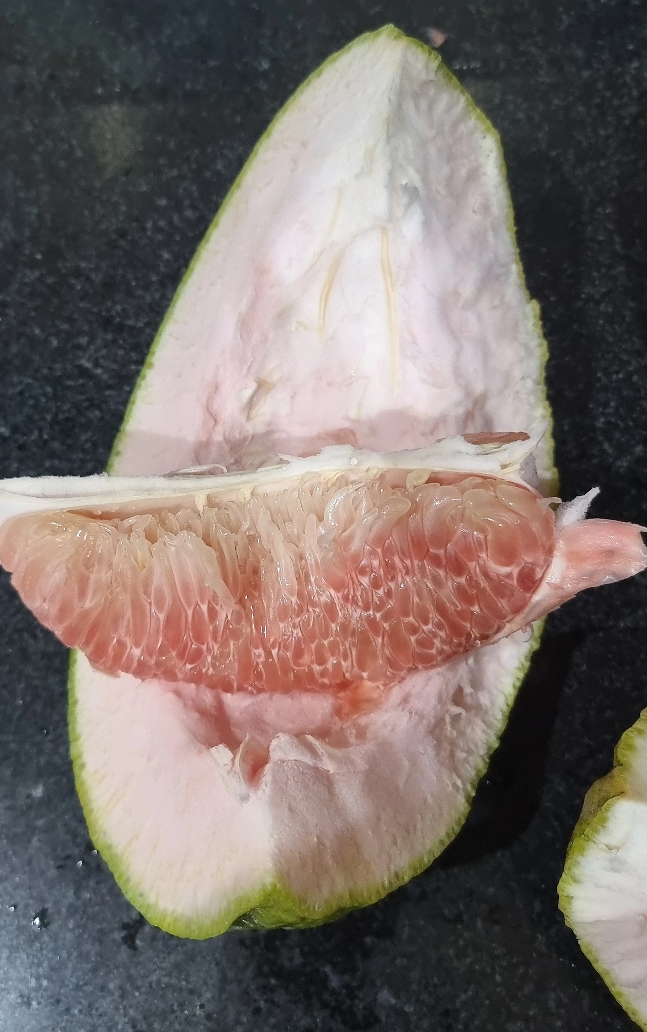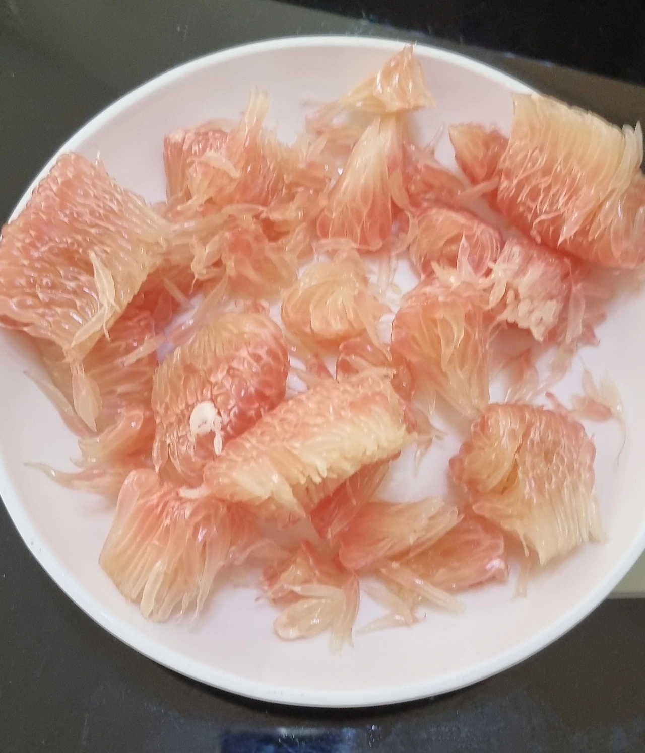 발리에서 처음 맛보았던 포멜로를 베트남에서도 반갑게 만났다. 감귤과에서 가장 큰 과일에 속하는 이 과일은 외피가 두꺼운 솜처럼 포근하게 알맹이를 감싸고 있다. 과육 크기가 워낙에 크다 보니 알갱이가 톡톡 씹히는 맛이 있어서 아들이 좋아하는 열대 과일이다. 알맹이를 두르고 있는 얇은 껍질을 벗겨내니 꼭 꽃게를 발라낸 것처럼 조각조각이다.