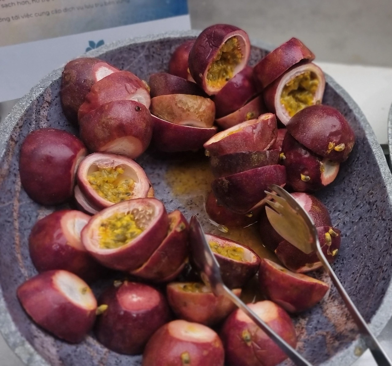 패션 푸르트는, 학교 급식에서 얼린 과일로 종종 맛보았다. 누런 콧물처럼 끈적한 데다 시큼한 맛에 섣불리 식판에 담지 않았다. 이번에 베트남에 와서도 망고스틴인 줄 착각하고 잔뜩 사더니 웬걸, 처음부터 반갑지 않은 손님이 되어버렸다. 그런데, 겉껍질이 매끈함에서 쭈글이가 되는 과정에서 과일이 익어가니 생각지 못했던 단맛이 돈다. 반으로 쪼개어 가장자리를 살살 긁어내듯이 달래며 들어내면 덩어리째 통째로 과육을 입에 털어 넣을 수 있다. 가판대에서 사탕수수와 더해진 패션 푸르츠 주스는 기대 이상의 맛으로 또다시 찾게 된다.