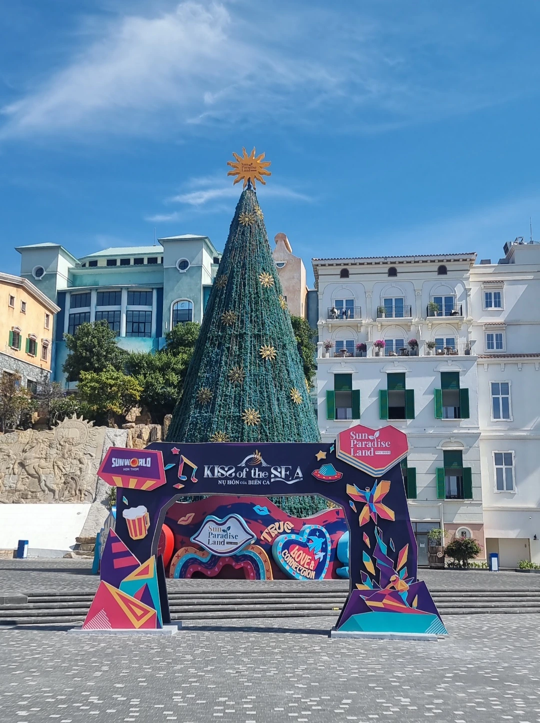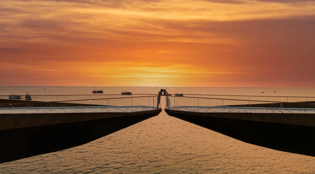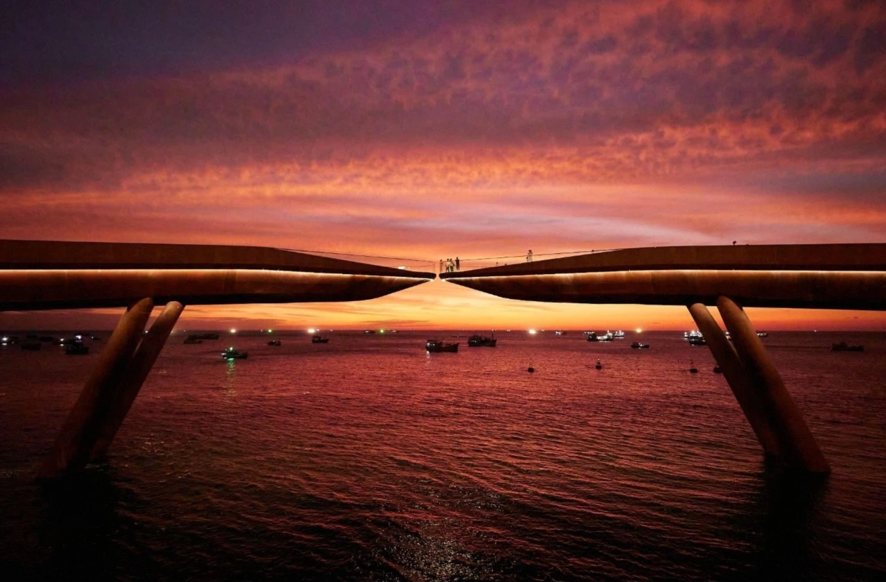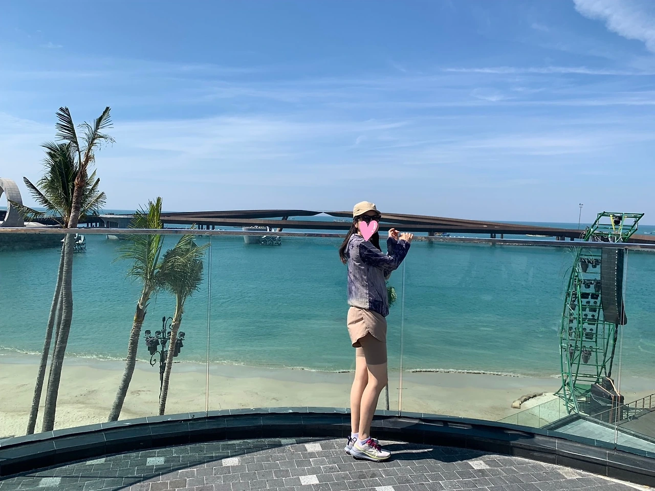 우선, <Kiss Bridge>는 '세계에서 가장 아름다운 일몰 장소'로 꼽히는 명소다. 아름다운 바다를 배경으로 한 스토리와 일몰 포인트가 결합된 낭만적인 포토존이기도 하다. 65도 기울어진 기둥이 받치고 있는 두 개의 평형판 위에 남녀가 각자 반대 방향에서 걸어와 키스할 때 태양이 지는 지점과 정확하게 포개어지는 인생샷을 찍을 수 있다. 매년 1월 1일, 프러포즈를 위한 커플들의 인기 몰이 장소라고 한다. 양쪽에서 줄을 서서 자기 인연과 '만남'의 결실을 카메라에 담으려는 사람들로 북새통을 이룬다. 감성이 메마른 것인지 열정이 식은 것인지, 개인적으로 그 북적임에 합류하고 싶지는 않아 배경으로 한컷 찍었다. 다리 아래로 흐르는 바다는 인공미가 넘친다. 선셋 타운 자체가 특별 프로젝트로 조성된 곳이니 어쩔 수 없이 감안해야 할 부분이다.