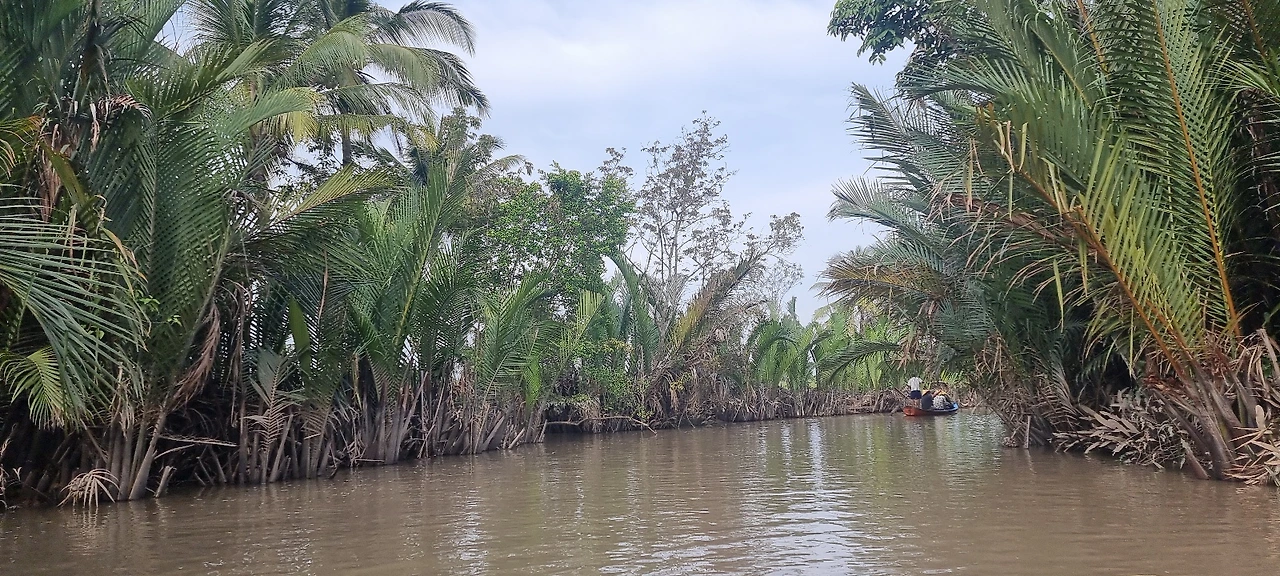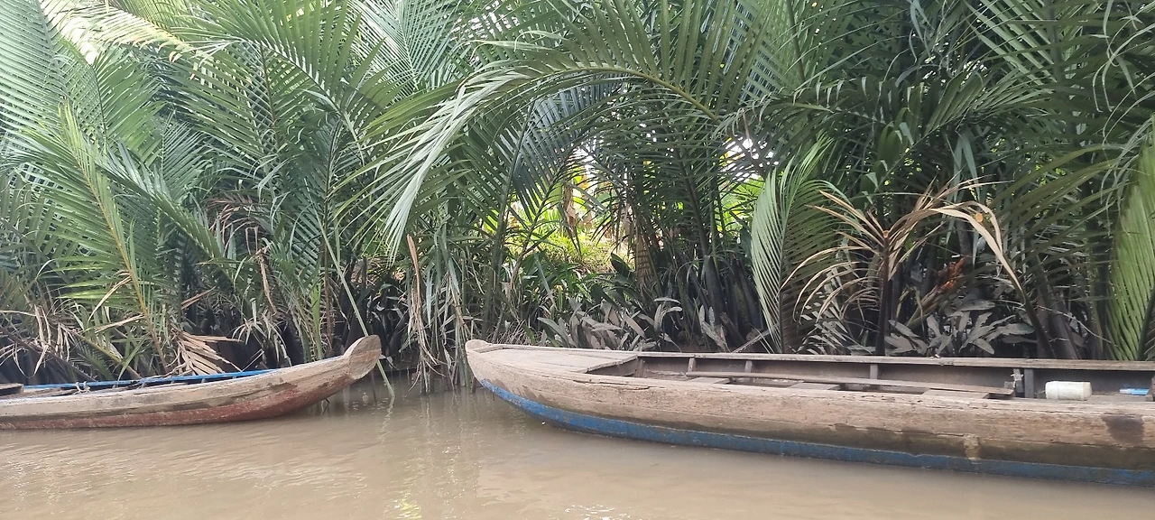 호찌민에서 두 시간가량 차를 타고 가서 직접 마주한 메콩강은 뿌옇고 탁한 기운이 가득하다. 진한 황톳물은 중국의 댐 건설로 인한 하류층의 생태계 변화로 인한 것이라고 한다. 양 옆으로 우거진 열대 수풀 사이로 보트를 타고 들어가는 풍경이 이색적이다. 노 젓는 여인이 관광객들을 위해 베트남 고깔모자(non la)를 하나씩 준다. 센스 있다!라고 탄복했는데, 알고 봤더니 하선시 팁을 받기 위한 깜찍 전략이었다.