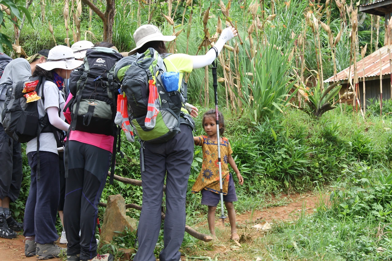 여벌 옷 한 벌, 속옷, 판초, 침낭, 세면도구, 비상식량, 의약품, 후원품, 물통 등 최소한으로 짐을 줄였는데도 배낭의 무게가 7~8kg이다. 한 마을에서 다음 마을까지 가기 위해 1~2시간을 이고 지고 걸어야 하는 짐이다. 선교사님을 필두로 청년 5명은 등산화와 폴대에 의지해서 헉헉거리며 가다 쉬다를 반복한다. 마을 어귀에서 현지인 꼬마 둘을 만났다. 신기한 듯 외부인을 바라보던 그 녀석들은 이내 경사진 비탈길을 샌들 하나 달랑 신고 어깨동무를 하며 쌩하니 달려간다. 굽이굽이 산길을 넘어 다시며 어렸을 적부터 다져진 그들의 체력은 세계 최강이다.
