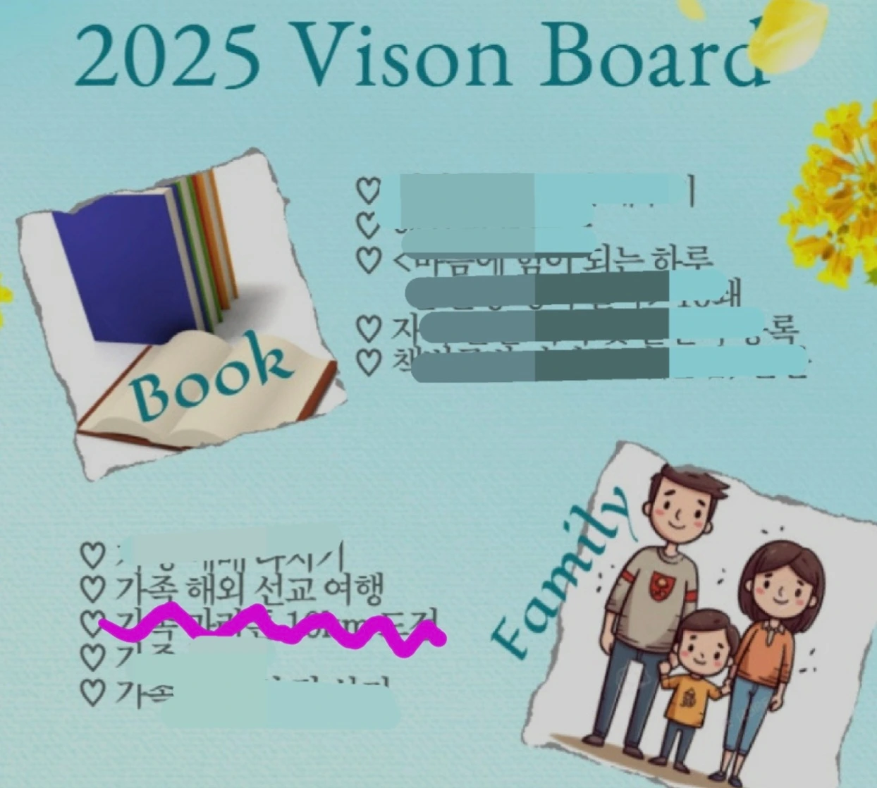 2025년 올해 비전 보드다. 가족 선교 여행은 개인적인 꿈이었기에 여름 방학 달력에 네팔 여행 일정이 가장 먼저 입력되었다. 시간이 흐르면서 조금씩 다른 일정들이 더해졌다. 어느덧 여름 스케줄이 빼곡히 들어찼다. 마음이 분주해지고 조금씩 부담감이 더해진다. '괜히 무리해서 네팔을 간다고 했나' 하는 마음이 꼬물꼬물 올라온다. 눈앞에 놓인 일처리에 급급하다 보니, 네팔은 우선순위에서 점점 밀려났다. 가장 처음 입력했던 여행이 가장 나중에 처리할 과업이 되다 보니 초심을 잃어 간다. 체력 보강을 한답시고 잘 먹기만 하고, 마음의 준비는 뒷전이 되어 버린 탓이다.