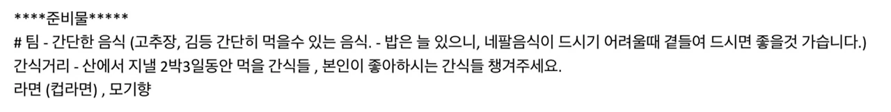 두 번째, 짐 싸기 리스트를 짠다. 7박 8일간의 길면 길고 짧으면 짧은 여행을 위해 삼 인분의 짐을 싸야 한다. 전도사님의 물품을 받아 실어 가야 하기에 추가 비용 없이 우리가 비행기로 태워 가져갈 수 있는 짐은 총 두 개다. 짐의 경량화, 최소화가 목표다. 네팔 선교사님께서 보내주신 팀별, 개인별 목록부터 살펴본다.