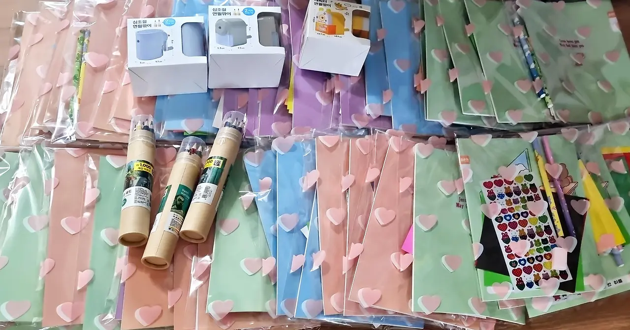 첫 번째, 후원물품 구매다. 산간 지역에 위치한 제르 기다 초등학교를 방문할 예정이다. 학생 55명, 교사 2명을 대상으로 진행할 프로그램을 구상하고, 아이들에게 줄 선물들을 고민한다. 산골 마을 학생들에게 가장 필요한 것은? 단연 학용품이다. 한국산 질 좋은 노트, 지우개, 연필, 연필깎이, 색연필 등을 떠올린다. 색종이와 스티커도 덤으로 넣어 아들에게 부탁해서 종이접기도 가르쳐주면 어떨까 싶다. 한바탕 쇼핑을 하고 와서 쭈그리고 앉아 포장지에 나눠 담는다. 반 아이들 선물 싸는데 수년간 훈련이 되었기에 껌이지!라고 생각했는데 웬걸? 워낙 인원수가 많다 보니 허리가 끊어질 것 같다. 꾸역꾸역 스티커 작업까지 완료했다.