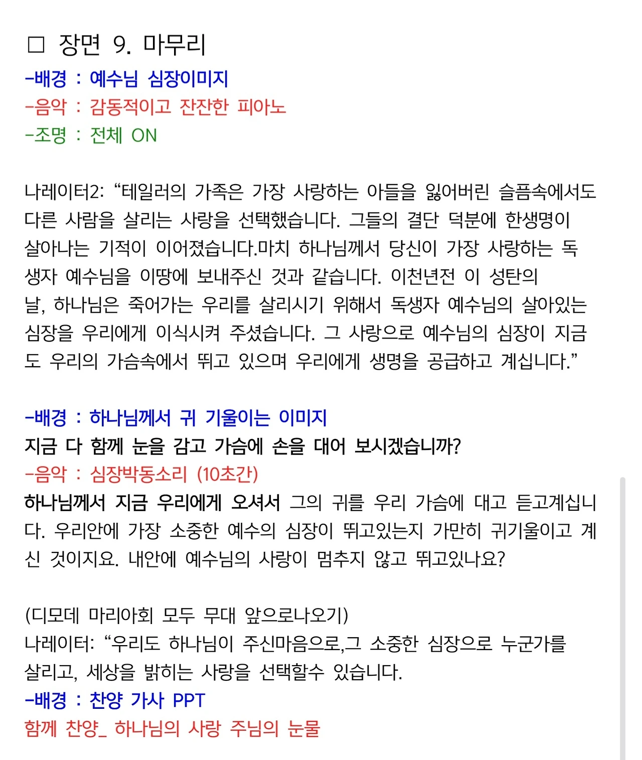 저마다의 합리적인 이유로 저항감이 더해졌다. 작은 교회다 보니 안 그래도 사역이 바쁜데 추가적으로 무엇을 해야 하는 것 자체가 부담이 되었는지도 모른다. 물론 한숨 섞인 시간들이 지나가고 '순종'에 무게가 더 실렸다. '어떤 성극을 무대에 올려야 할까?' 유튜브를 찾아보기도 하고 단막극 형식을 접고 완전히 다른 무대를 준비하는 건 어떨까 하는 아이디어들이 오고 갔다. 다행히도 한 집사님의 헌신으로 실화를 바탕으로 한 대본이 탄생되었다. 스토리를 듣자마자 마음이 뭉클했다. 일상을 살아가던 단란한 가정에 한 아이가 사고로 죽는 비극에서 시작된다. 자녀를 잃은 슬픔 속에서도 부모는 아이의 심장을 기증하여 생명을 살리는 선택을 한다. 추후에 그 부모와 심장 이식 수혜자가 서로 만나는 극적인 장면이 연출되면서 눈물이 봇물처럼 터진다. 예수님의 죽음으로 우리에게 심장이 이식되고, 생명이 시작되었다는 성탄의 메시지까지 잘 담을 수 있다.
