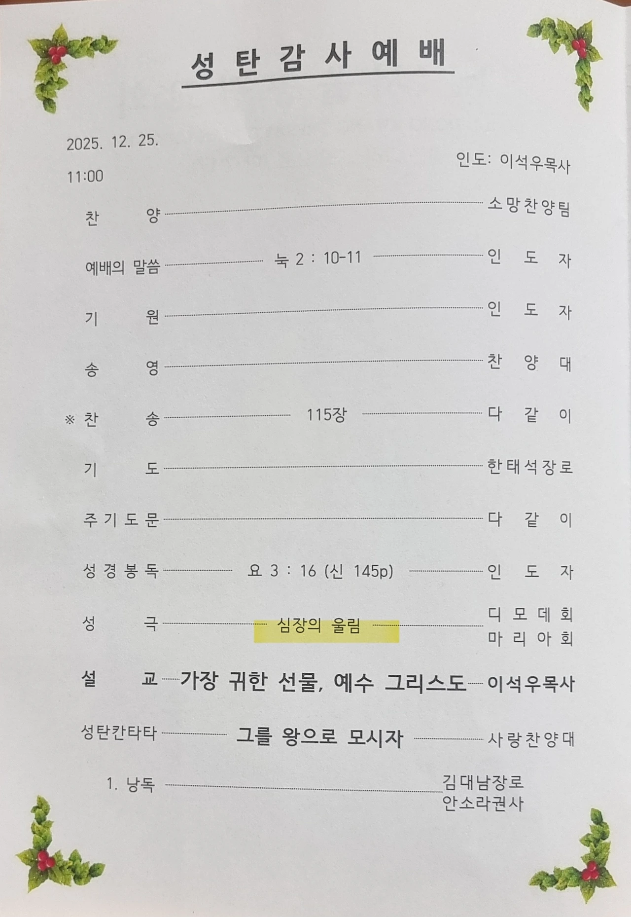 연습을 할 때마다 아들도 눈이 빨개졌다. 안 울어야지... 했는데 웬걸. 실제 무대에서도 눈물을 쏟았다. 나만이 아니다. 성도님들도 함께 울었다. 다 같이 예수님이 우리 가슴에 넣어준 심장 소리를 들었다. 마지막으로 올려드린 [하나님의 사랑 주님의 눈물] 찬양이 잔잔한 감동을 더했다. 성탄의 진정한 주인공 예수님의 탄생이 마음에 새겨지는 날, 생명을 얻게 된 기쁨과 평안이 모든 이들이게 깃든 하루였길 바란다.