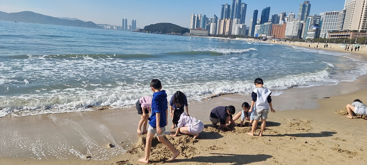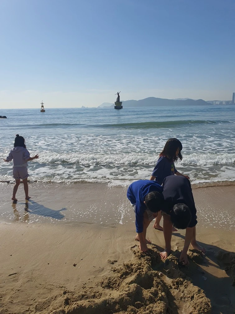 아이들은 1박 2일 동안 여유와 즐거움으로 시간을 꽉 채운다. 그 어떤 개입 없이도 그저 자기들끼리. 실내에서는 베개 싸움, 귤껍질 길게 까기, 경도 등 매 순간 놀이를 바꾼다. 실외에서는 해변에서 하루 종일 바닷물, 모래와 함께 뒹군다. 놀랍게도 부산의 날씨가 너무 따뜻하여 한겨울에 반팔을 입고 놀 수 있었다. 이것저것 아이들과 할 프로그램을 짜갔지만 그저 풀어놓은 시간 안에 노니는 모습을 보며 내년부터는 아무것도 준비하지 말자는 데 모두 동의했다. 어른들이 짜준 프로그램 없이도 여백 속에 푹 잠겨 자기들끼리 주도적으로 시간을 끌어 쓰는 아이들을 바라보며 그저 므흣했다. 때 되면 배만 채워주면 되었다. 이렇게 자유로운 아이들을 어떤 틀에 가둔다는 것 자체가 미안한 마음이 들 수도 있겠다 싶다.