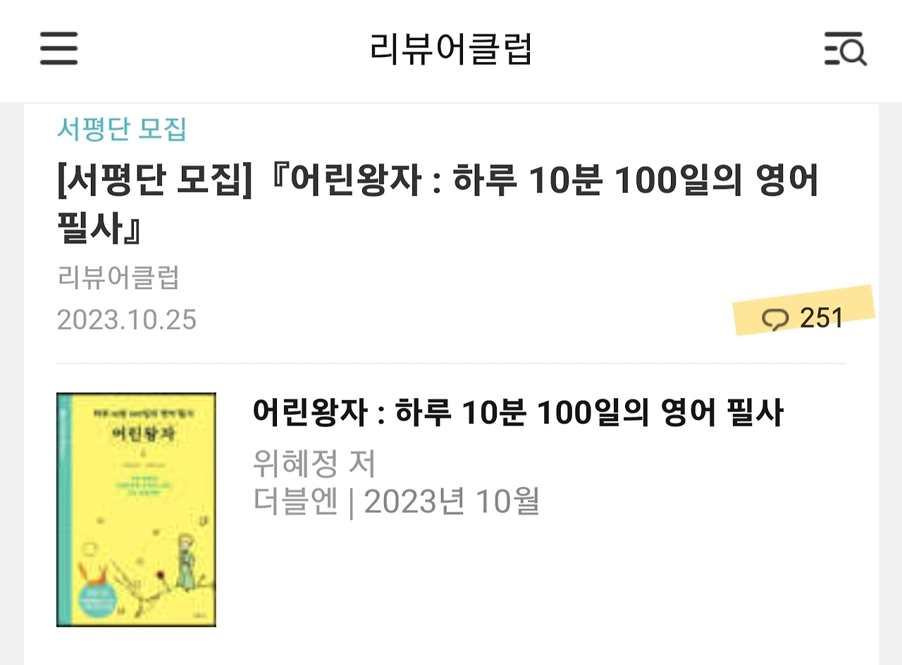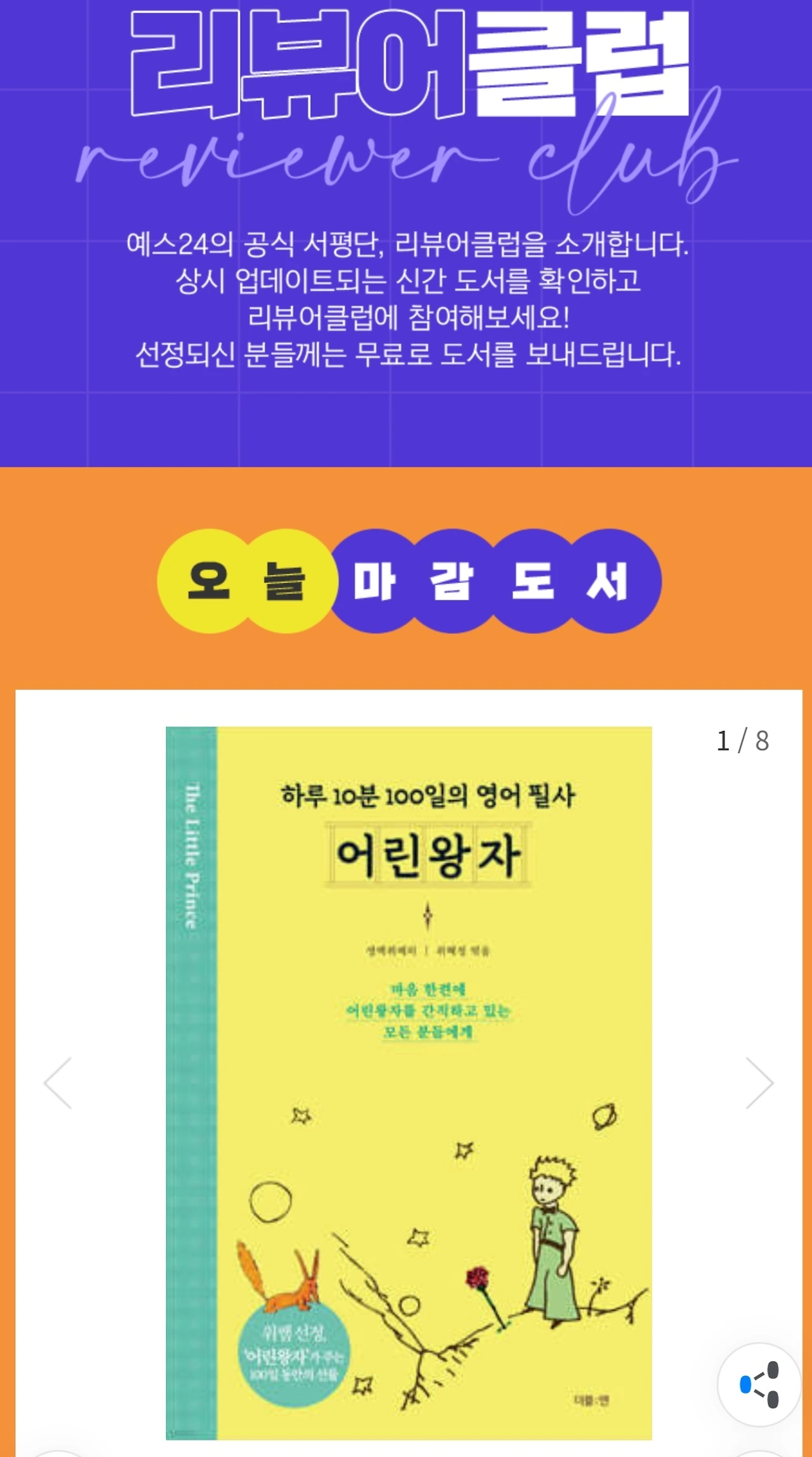 서평 역시 신간 소개 마케팅의 주요 수단 중 하나이다. 출판사는 전용 블로그나 홈페이지, 인터넷 카페, 인터넷 서점의 서평클럽 등 다양한 경로를 통하여 서평단을 모집한다. 온라인 서평은 추후에 책의 검색 노출량을 높이는 데 일조할 뿐만 아니라, 서평단 신청자 수는 독자들의 반응을 미리 살필 수 있는 지표가 되므로 출판사에서 자주 활용하는 툴이다. 편집장님께서 Yes24 <리뷰어 클럽>에 서평단 모집 공고를 낼 것이라는 언질을 주셨다. 신청 마감일에 클릭을 해보았더니 마감일이 같은 8권의 책 중에서 가장 많은 신청자수로 책이 첫 화면에 떠있다.