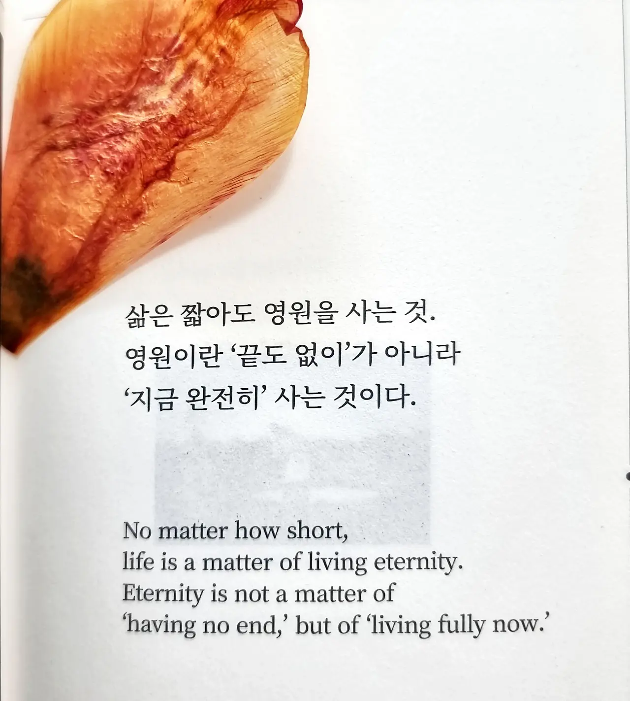 넷째, 짧은 명언들을 읽고 생각을 쓰기 시작했다. 큰 도움이 되었던 책은 박노해의 <걷는 독서>였다. 그분의 정치적 성향은 제쳐두고, 곧은 의지로 굴곡진 생을 살아낸, 삶 자체에서 우러나는 식견의 깊이가 단 한 두 문장에 응집되어 있는 책이다. 문구를 읽을 때마다 전율이 흘렀다. 책 사이즈가 작고 두께감도 있어서 페이지 사이사이에 꽃잎도 예쁘게 말릴 수 있었다. 작가가 직접 찍은 사진과 영어 번역문까지 함께 실려 있어 영어필사와도 완벽하게 맞물렸다. 문장을 질겅질겅 곱씹으며 나의 삶에 적용한 나만의 사유를 글에 담아내기 시작했다.글감이 바닥났을 때 멋들어진 '인용구'를 만나는 것은 확실한 마중물이 되어준다.