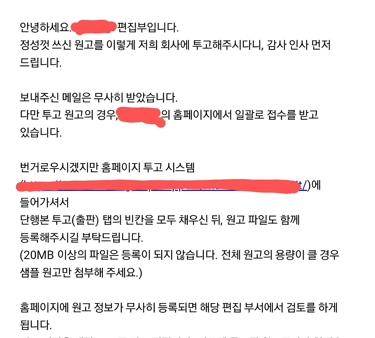 첫째, 출판사 원고 투고 메일은 홈페이지나 SNS에 게시되어 있다. 대개 메일로 출간 기획서와 원고를 보내면 된다. 주의할 것은 출판사에 따라(주로 대형 출판사) 메일이 아닌 홈페이지에 직접 원고 투고를 등록해야 하는 경우도 있다는 점이다. 친절하게 안내를 해주면 상관없지만 그렇지 않은 경우 연락 없이 투고 접수가 되지 않는 낭패를 볼 수 있다.