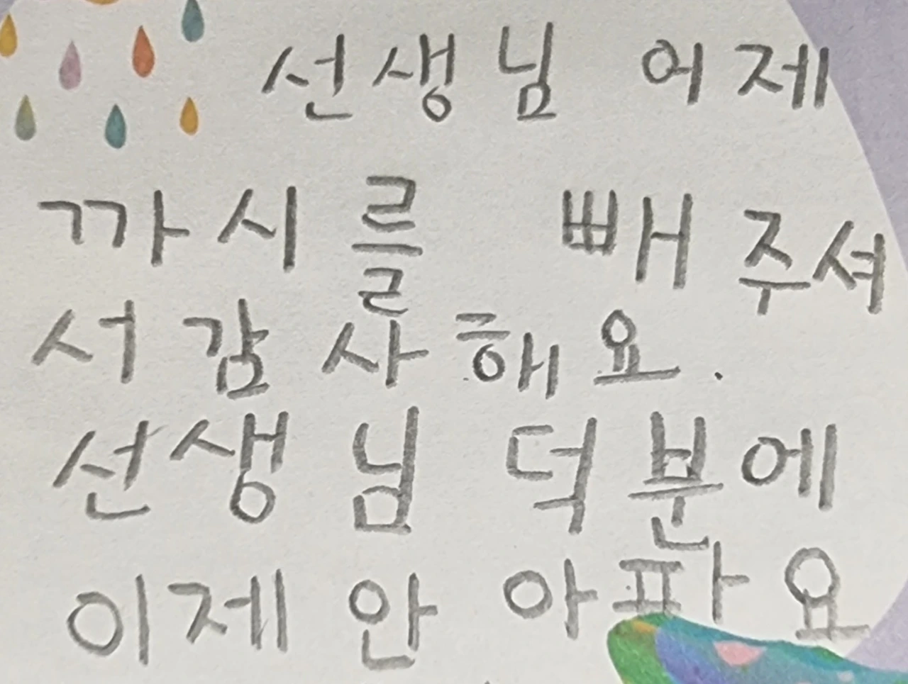 보건 선생님 역시 비슷한 아들을 둔 것이 신의 한 수였다. 엄마인 난 이해할 수 없었지만 선생님은 엄마의 마음으로 이해하고 계셨다. 겁 많은 아이의 밑도 끝도 없는 그 공포를. 채혈을 할 때도 피가 빠져나가는 것을 물끄러미 바라보고 있는 나의 시선으로 바라볼 때 아들의 자지러지는 반응들은 이해불가다. 40분이라는 눈물겨운 밀당의 실랑이 속에서 너무하다 싶은 마음뿐이었다. 일단 아들도 민망함과 고마움이 있었는지 보건 선생님께 드릴 편지를 쓴다.