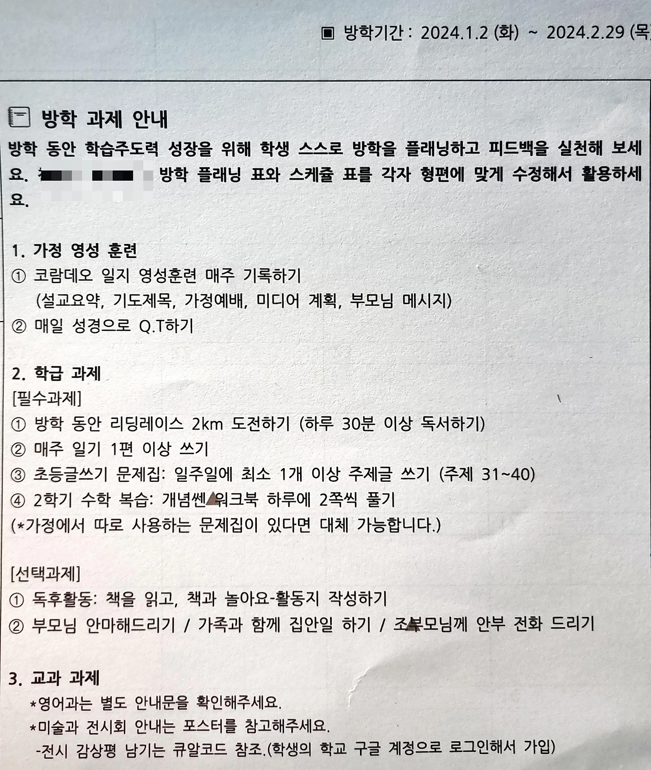 <겨울방학 과제 안내문>