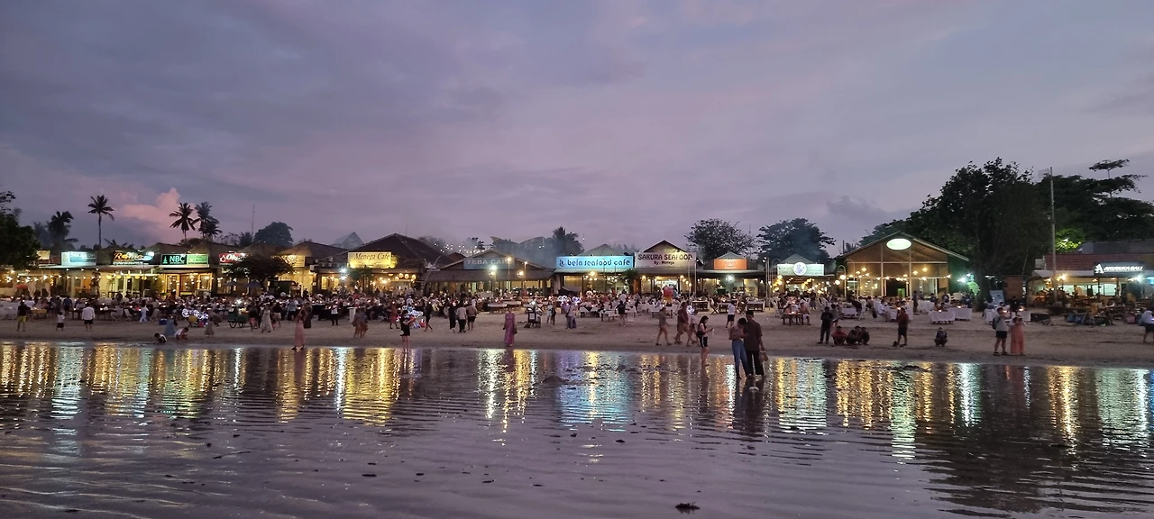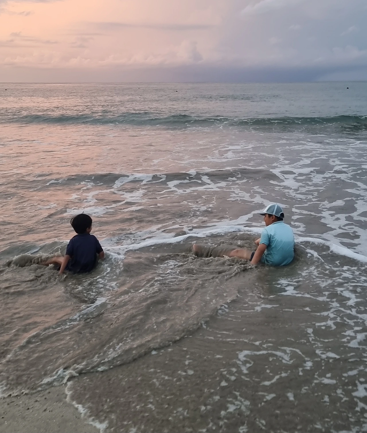 한참 게잡이를 한 후, 식당에서 차려준 크랩, 오징어, 생선, 새우, 조개 등의 해산물 디너를 만찬으로 즐긴다. 유명 해변이라 그런지 외국인들도 많지만 한국인들로 북적하다. 바로 앞 뒤로 한국인 신혼여행 커플과 가족 단위 여행객들이 여유롭게 저녁 식사와 바다의 향을 즐긴다. 여기저기서 한국말이 들려오니 정서적인 편안함은 있다. 게잡이로 몸을 푼 아들 녀석은 뒤늦게 바다 수영에 맛을 들였다. 갈아입을 옷을 따로 챙겨 갔기에 맘껏 놀라고 했다. 바다가 얕고 파도가 강하지 않아서 찰랑거리는 물의 터치를 느끼며 발 담그고 몸 담그기 좋은 곳이다.