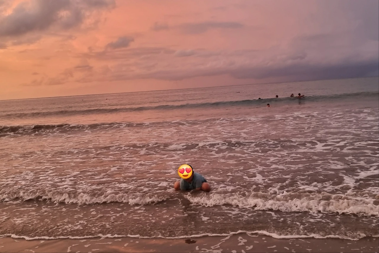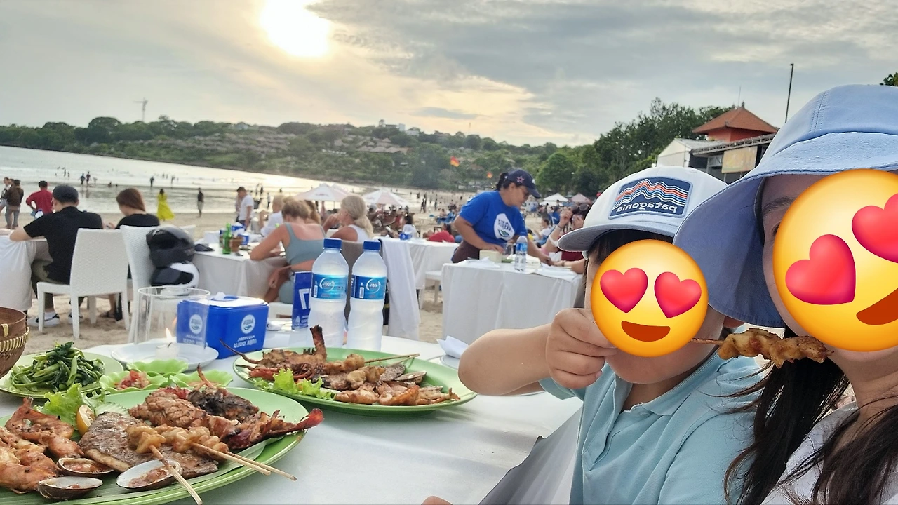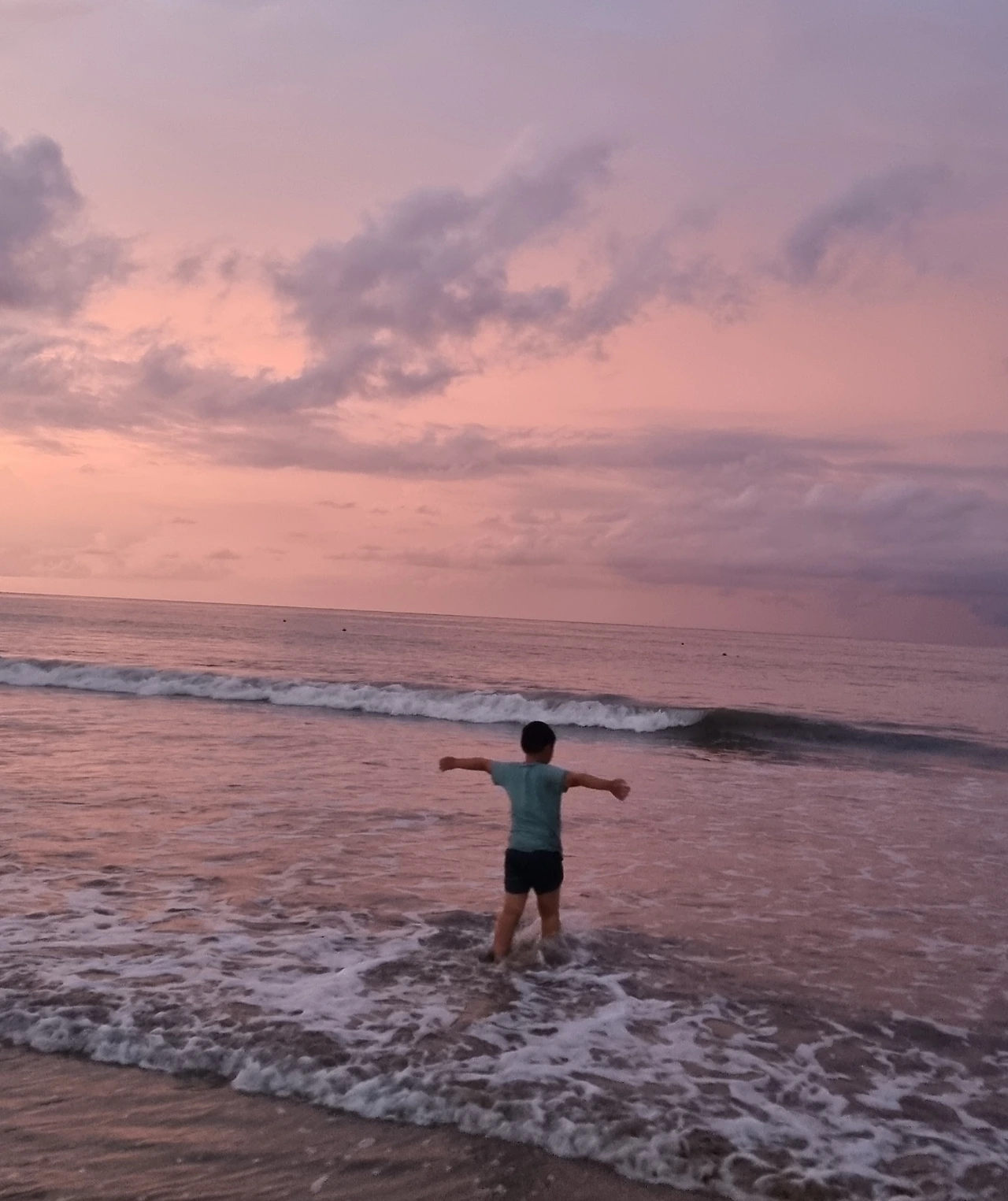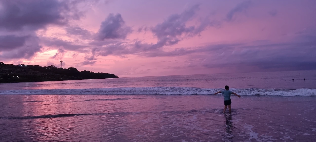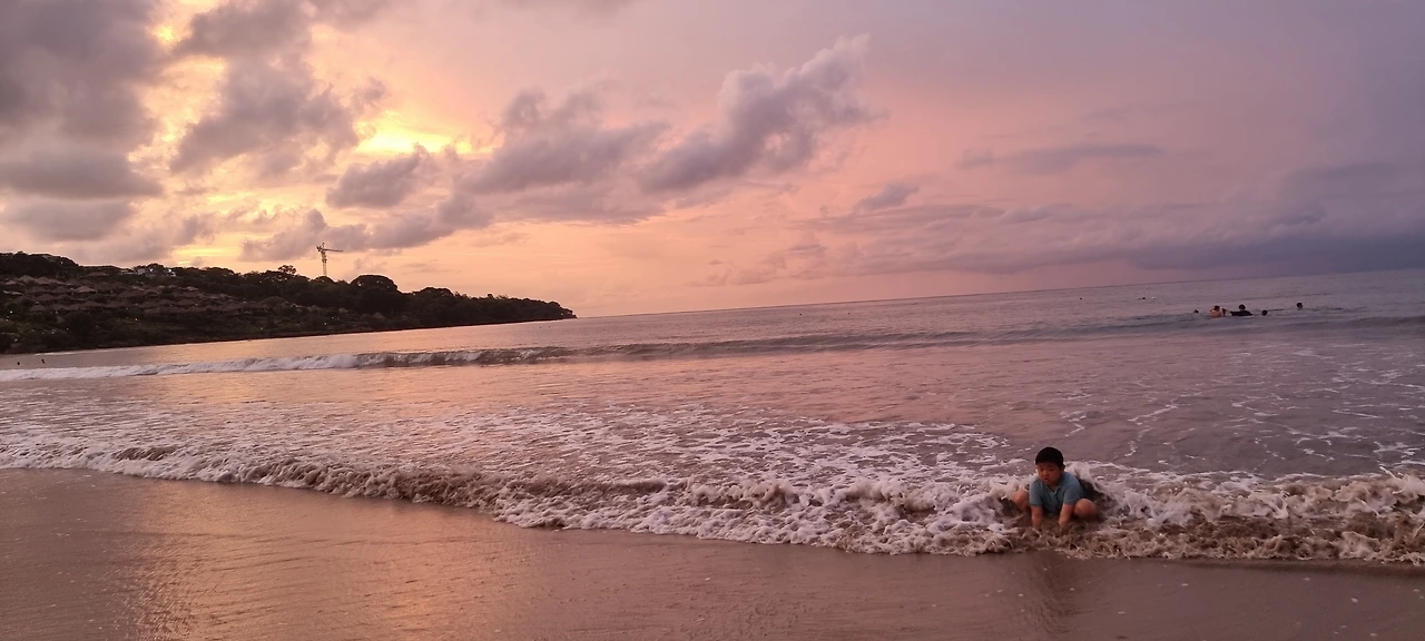 쭉 뻗은 수평선 위로 층층이 피어오른 구름, 끊임없이 물결에 부서지는 새하얀 파도의 향연, 그 어떤 인공 물감으로도 재현할 수 없는 저녁노을의 화려한 색조는 가슴속에 잊히지 않는 예술로 담겼다. 남편은 총각 시절 짐바란 해변에 대한 기억이 그리 낭만적이지않았다고 하던데 아들과 나에겐 최고의 시간이었다. 나중에 셋이서 완전체가 되어 다시 오면 또 다른 맛을 느끼지 않을까 싶다. 밤늦게 폭죽놀이도 하며 오후부터 저녁을 아름다운 색감으로 물들여준 우리의 시간에 무한한 감사를 느끼는 하루였다.