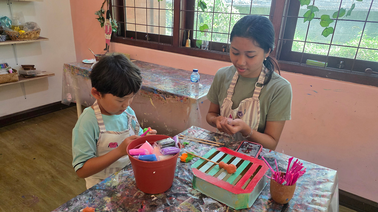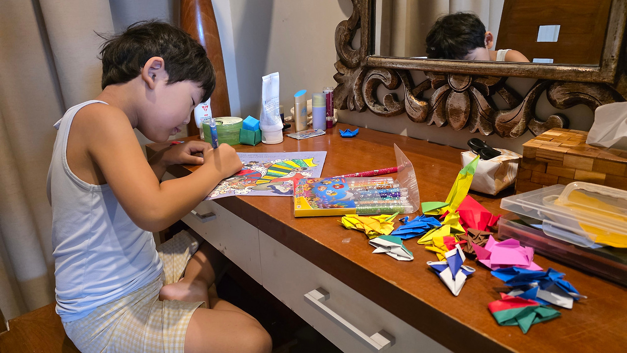 새로운 데이 클래스를 찾아갔다. 미술학원이다. 아들이 좋아하는 만들기 수업을 예약했다. 말없이 선생님과 색칠을 시작했다. 얼굴 표정 변화 없이 내내 진지한 표정으로 만들기에 집중했다. 선생님은 아들이 설명을 못 알아들으면 사진을 보여줬다.