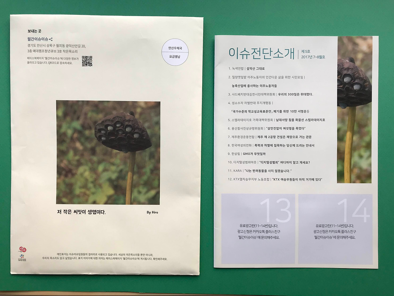 팀원으로 들어온 히로가 표지 이미지를 선정했습니다. 연꽃의 씨가 송알송알 맺혀있는 직접 찍은 사진이에요. 유료광고칸이 비어 있어서 조금 슬퍼 보이네요. 굿즈 봉투에 굿즈 설명을 적었더니 종이를 줄일 수 있었어요. 치킨 레시피 포스터는 디자이너 다다님께서 공장식 사육에 대해 비판적인 시선을 귀여운 그림체로 담아 주셨어요. 너무나 귀한 그림인데 우리가 드릴 수 있는 많지 않아서 죄송했어요.