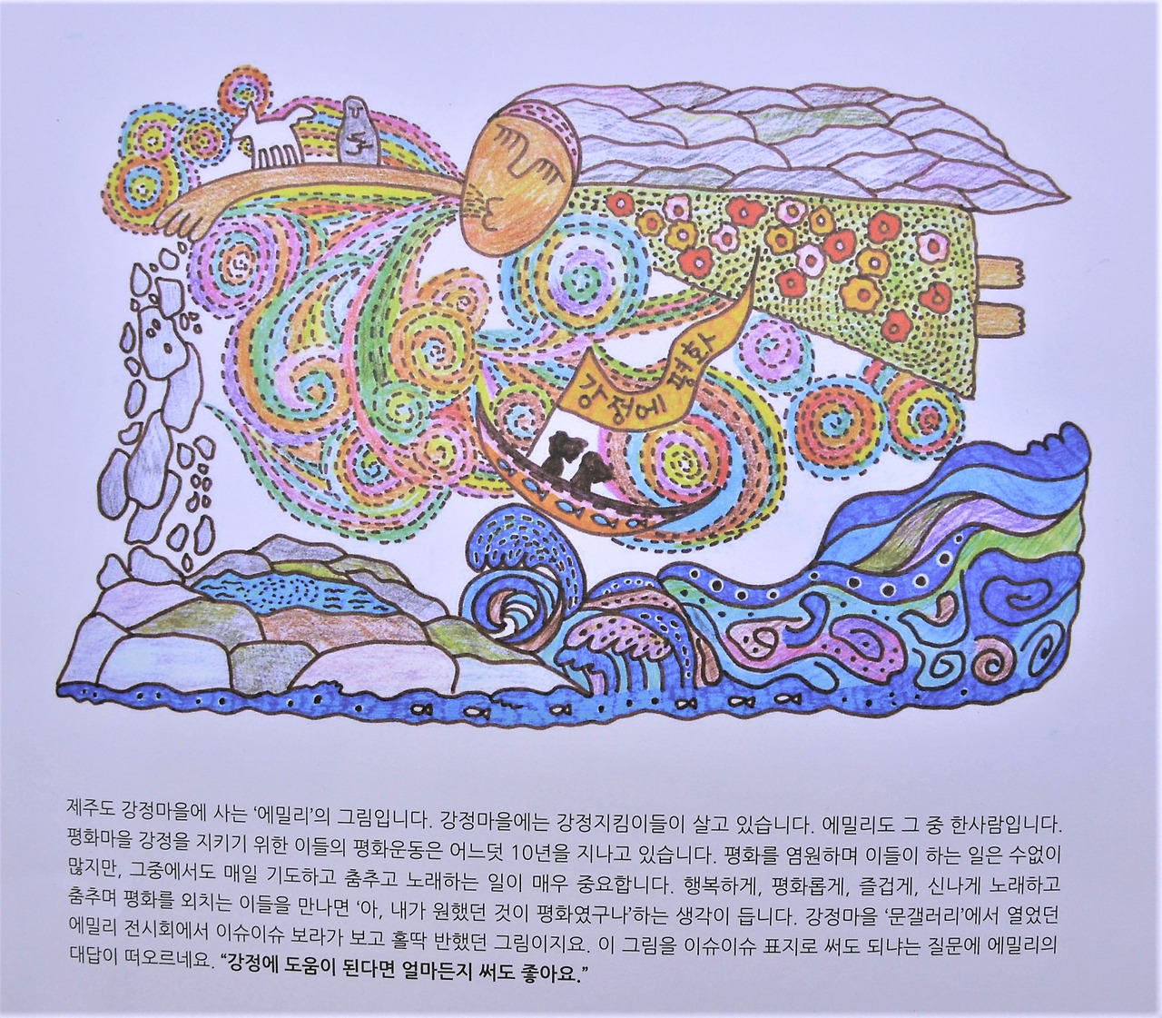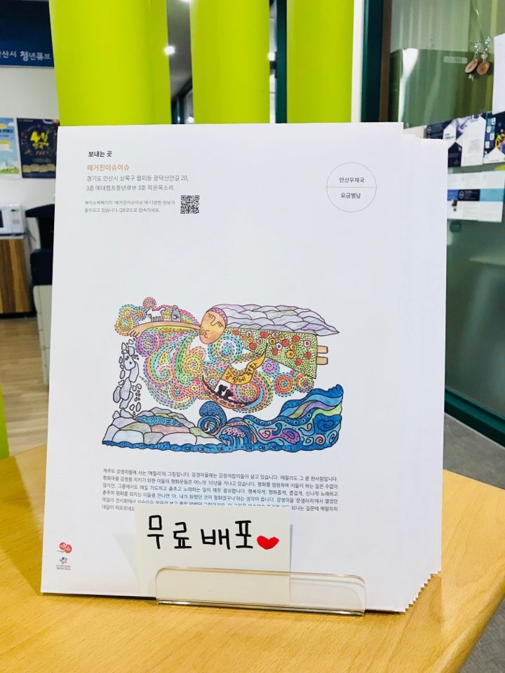 이번 호 봉투는 작가님의 그림을 지원받아 넣었어요. 제주도 강정마을의 활동하는 화가 에밀리에게 그림을 지원받았어요. 저희가 제주에 방문할 일이 있었는데 그때 에밀리가 전시회를 하고 있었거든요. 그 전시회에서 그림을 콕 집어 구매를 요청했으나, 매거진 이슈이슈에 넣을 거라면 그냥 써도 된다는 에밀리의 말에 그만... 대신 저희는 에밀리의 다른 그림을 구매해서 왔답니다!