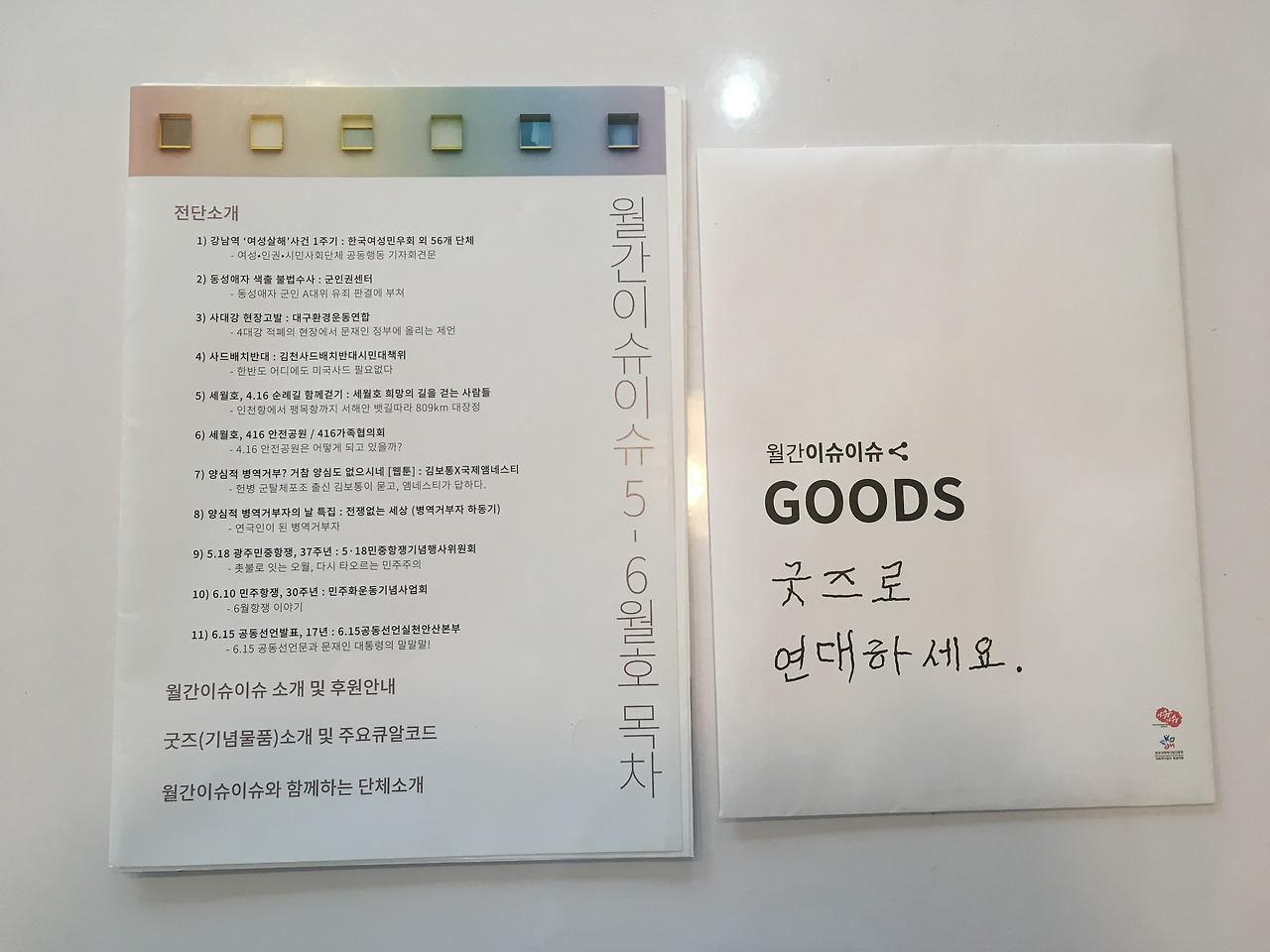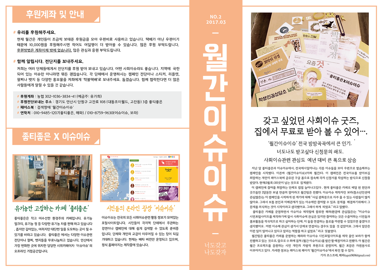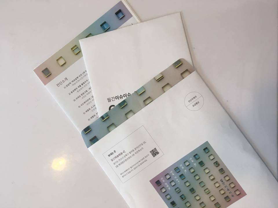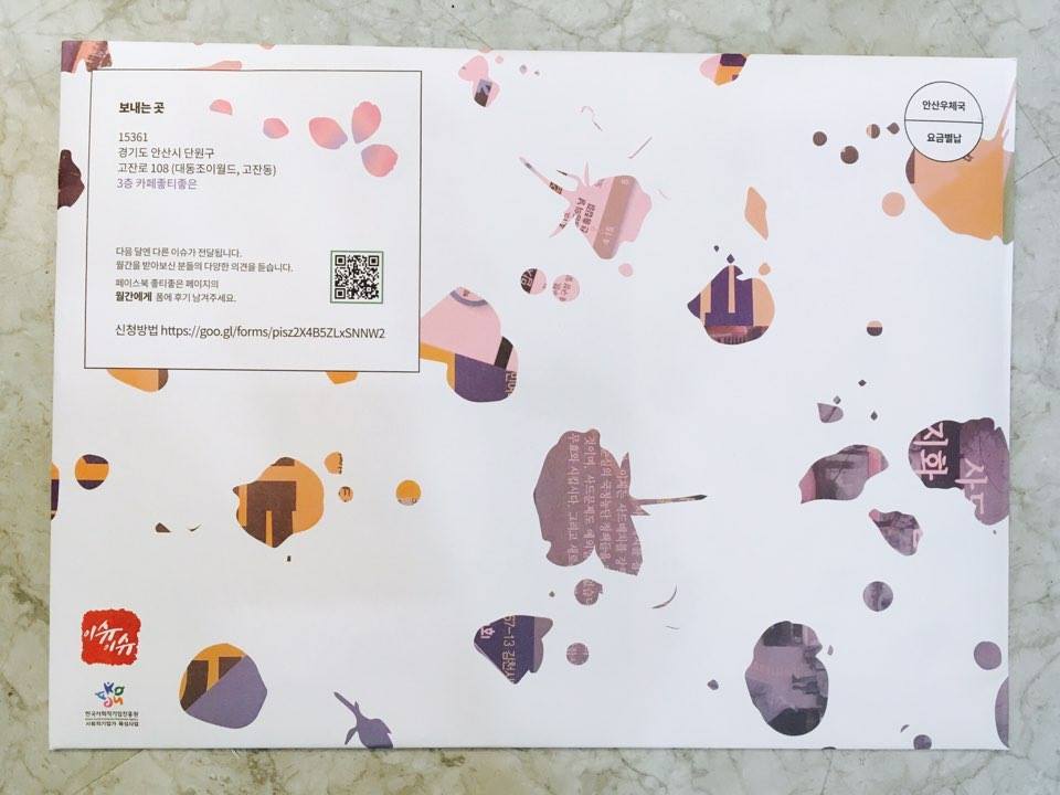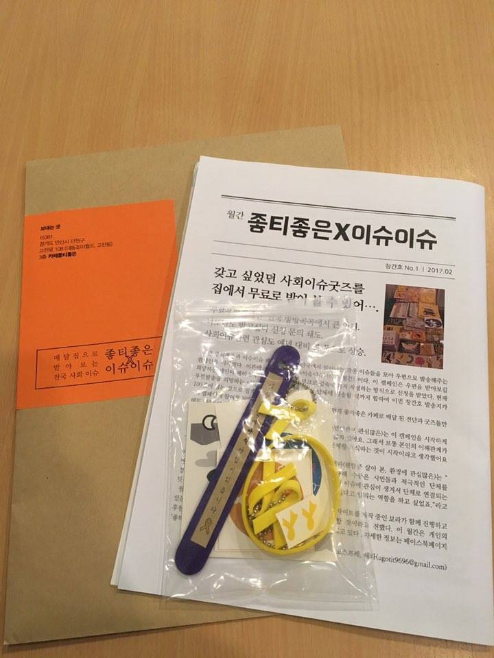해와와 보라, 둘이서 SNS로 지인들에게 신청을 받았습니다. 전단과 굿즈를 크라프트 대봉투에 넣어 매달 구독자에게 발송하겠다는 목표를 갖고 [월간이슈이슈]라고 이름을 지었습니다. 디자인과 글은 이때부터 해와가 담당했죠. (난 뭘 했지?) 포장은 해와가 운영하는 카페, 좋티좋은에서 둘이 작업했습니다. 우편비가 우리 둘에게 부담되기도 했고, 우편비라도 부담하고 싶은 사람들이 있을 거라고 생각하여 후원계좌를 열어 뒀습니다.