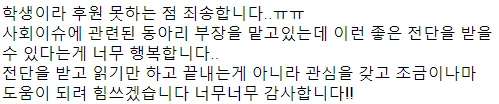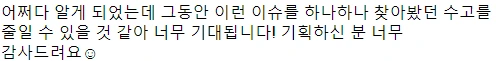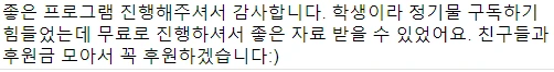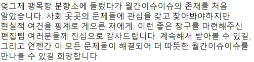 구독자 여러분들의 후기를 오랜만에 덧붙입니다. 이 많은 말들을 뒤로하고 발행을 접다니 내가 무슨 짓을 한건가 싶어 머리가 쭈뼛거리네요. 이렇게 많이 응원해주고, 기다려주셨는데 발행을 중단하게 되어 정말 정말 미안합니다. 여러분 보고 싶어요 ㅠㅠ 잘 지내고 계신가요.