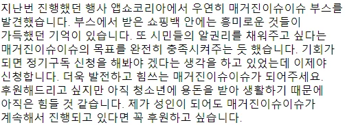 인쇄부수를 늘린다면 다음 인쇄 단위는 8,000부였어요. 결단이 필요했어요. 8,000부를 모두 인쇄하고, 포장하고, 발송하고, 길거리 나눔을 하는 게 가능할까. 우리 인건비도 없는데... 계속 가기 위해서는 부수를 늘려도 괜찮을 정도의 확실한 현금흐름이 필요했죠. 그래서 텀블벅을 통해 유료 구독자를 모아보자며 일을 도모했어요. https://www.tumblbug.com/mgzisuisu 하지만 중도에 포기해야 했죠. 70만 원으로는 우리가 유료 구독을 이어갈 수 없으니까요. 애초에 목표금액을 잘못 설정했던 것 같아요.