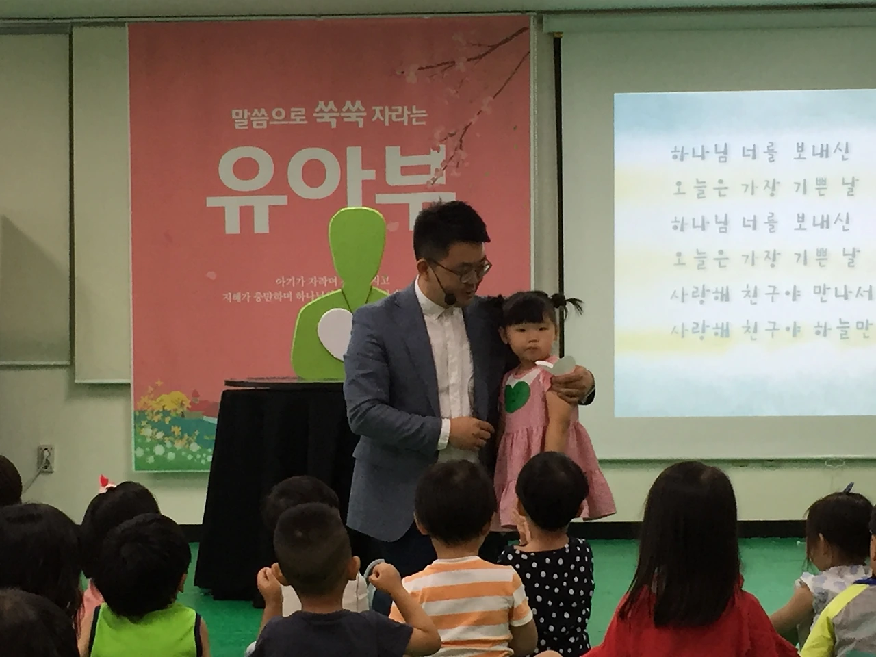 천사 같은 선생님들의 율동으로 유아부 예배가 시작되었다. 민진이는 내 무릎 위에 앉아서 율동을 따라 하기도 하고 작은 소리로 중얼중얼 찬양을 부르기도 했다. 아는 동요가 나왔을 때는 조금 더 자신감 있게 불렀다. 예배 마칠 즈음 어린아이 두 명이 앞에 나가 발표를 했다. 민진이는 작은 목소리로 나에게,
