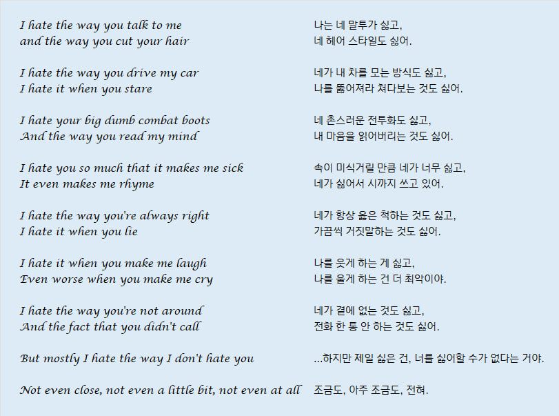무려 20년 전에 봤던 영화인데도 여자 주인공 캣이 남자 주인공 패트릭을 향해 자작시 "내가 널 사랑할 수 없는 10가지 이유(직역 - 내가 널 싫어하는 10가지 이유)"를 발표하장면만큼은 아직도 기억에 남아 있다.