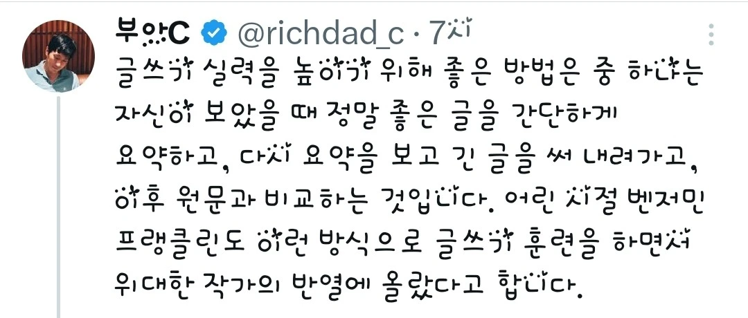 바로 '좋은 글 요약하기 -> 요약한 글을 보고 내가 써 보기 -> 원문과 비교하기'입니다.