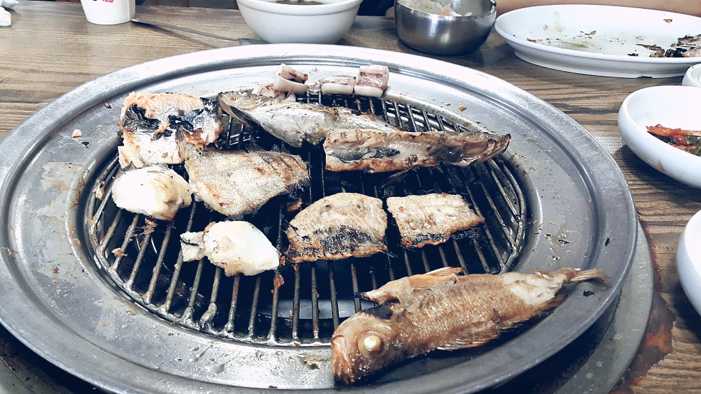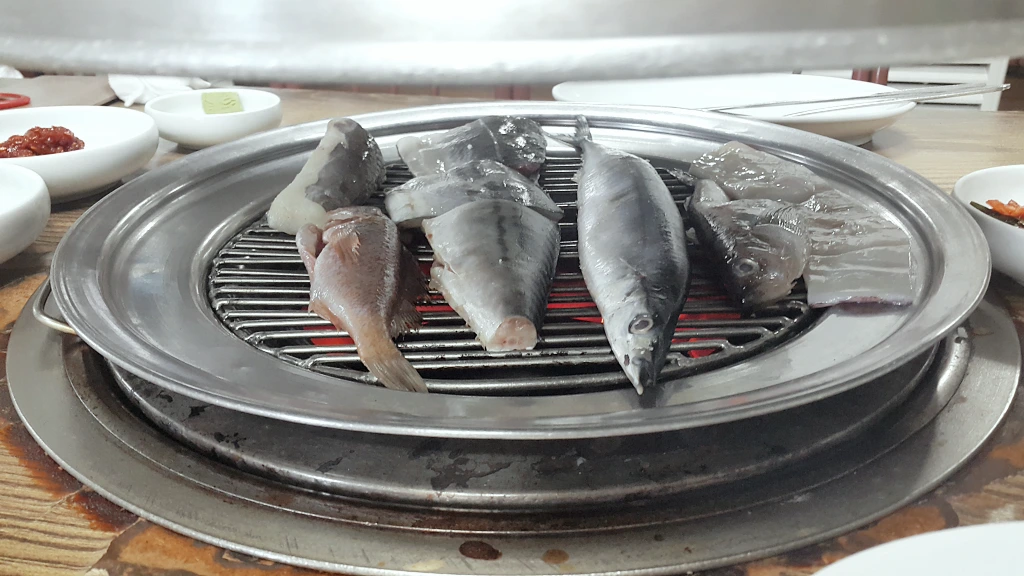 우리가 간 곳은 속초중앙시장 근처의 88생선구이라는 식당이었다. 흔히 생선구이집하면 구워져 나오는 생선을 떠올리는데 여기는 석쇠에 올려서 구워준다. 일단 비주얼이 신선했고 자리에서 구워주는 것도 신기했다. 센 불에 바짝 익혀진 생선들은 흔한 생선구이하고는 또 맛이 달랐다. 겉은 바삭바삭한데 속은 촉촉한 그런 맛이었다. 게다가 다양한 종류를 맛 볼 수 있으니, 그것도 매력적이었다.