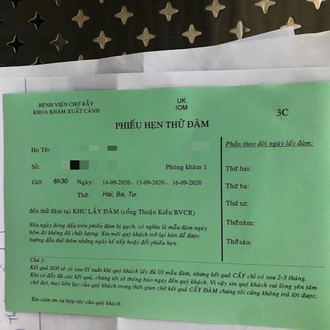 객담검사는 엑스레이 찍고 1주일 내에 시행되어야 한다고 나와있는데 여기에서 슬롯이 꽉 차서 안된다고 할 수도 있다. 그럴 때는 당황하지 말고 IOM 직원과 통화하도록 하면 알아서 잘 조율된다. 원래 객담검사는 7시 반부터 가능하다고 했지만 남편은 6시 반 슬롯을 배정받았다.